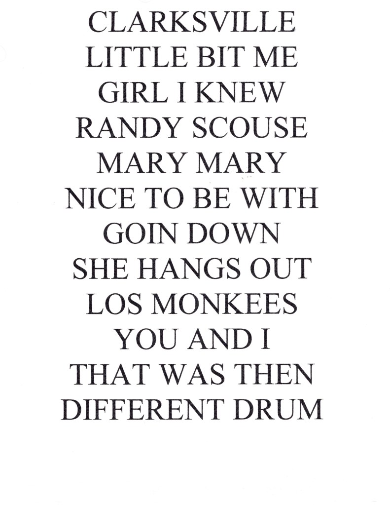 (THE MONKEES) : Overture, Last Train To Clarksville, A little Bit Me, The Girl That I Knew Somewhere, Randy Scrouse, Mary Mary, Goin’ Down, Nice To Be With, Monkees Theme (Foreign Versions), You & I, That Was Then This Is Now, Different Drum, Boogie Woogie Bugle Boy, Girl, Circle Sky, Valleri, Since I Fell, Here Comes Tomorrow (Free Forever), No Time, The Porpoise, Listen To The Band, Daydream Believer, Pleasant Valley Sunday, Stepping Stone, I’m A Believer