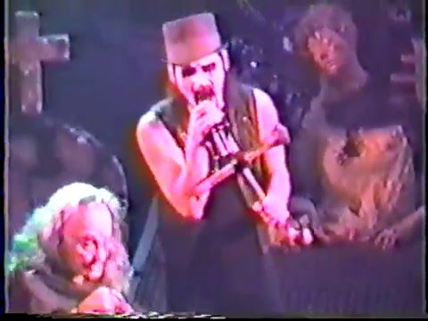 Tura Satana was supposed to open the show, but didn’t make it for some reason, leaving only Man Will Surrender, who I remember very little of that night. Just as well, since I was understandably distracted and eager to see my heroes for the first time. Monty came out first and started a little intro music on his keyboard, a riff that was reminiscent of Alice Cooper’s “I’m Eighteen”. Captain came out next, prancing about the stage and even doing a backwards somersault before strapping on his guitar. He had been known for wearing a red beret and white rimmed sunglasses, but he had neither of those on that night. Instead, he wore small John Lennon round sunglasses and he wore some sort of black, soft cotton long sleeved outfit with white line trim designs all over it and a matching soft, brimless hat. The whole piece looked as if it came from North Africa. He broke the ice with the crowd by introducing himself as Phil Collins and asking them if anyone wanted to suck his cock before launching into their first song, “Plan 9 Channel 7”. Dave was his usual vampirish self, pale with his hair slicked back wearing sunglasses and a long sleeved silk shirt with wide lapels and a deep V-neck, though he took the glasses off after a few songs. Patricia wore all black, though sported a subtle pair of Halloween devil horns through her long, black hair.