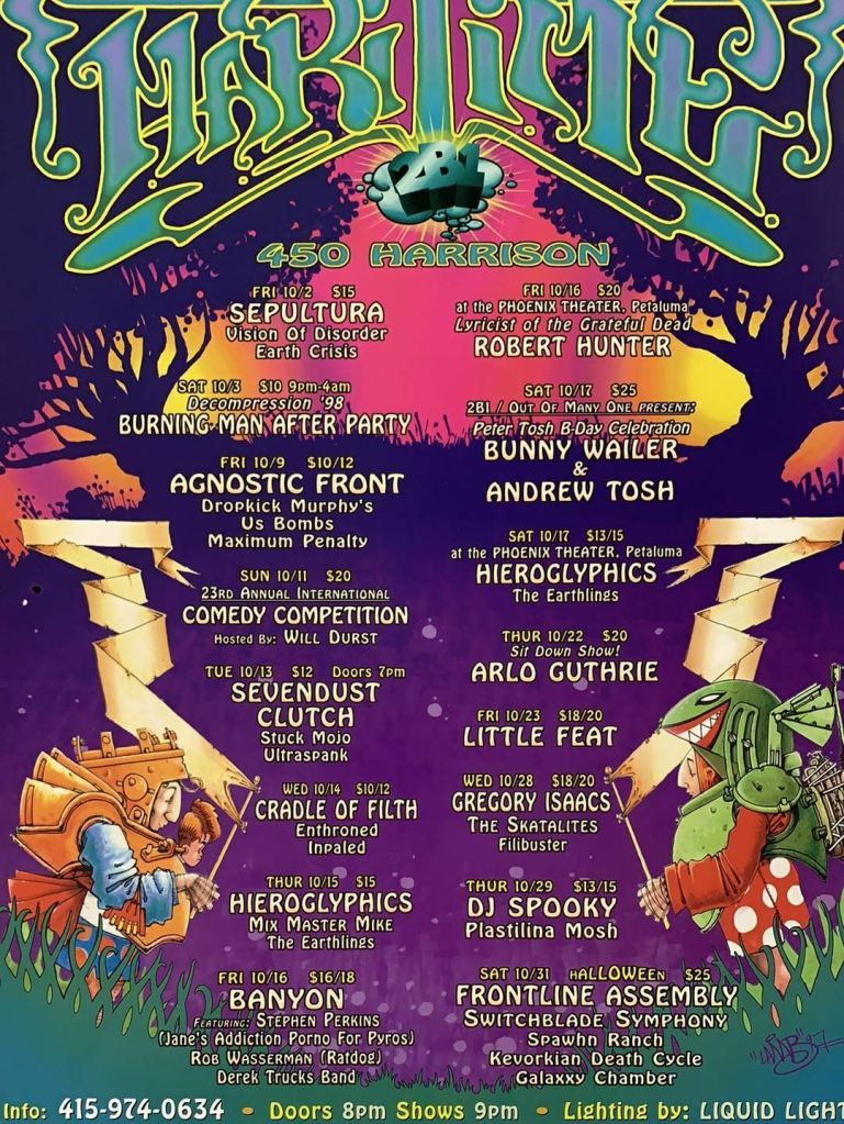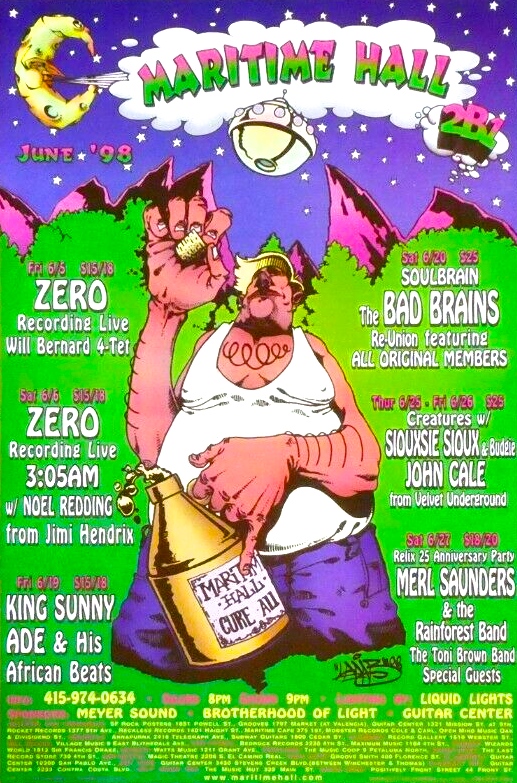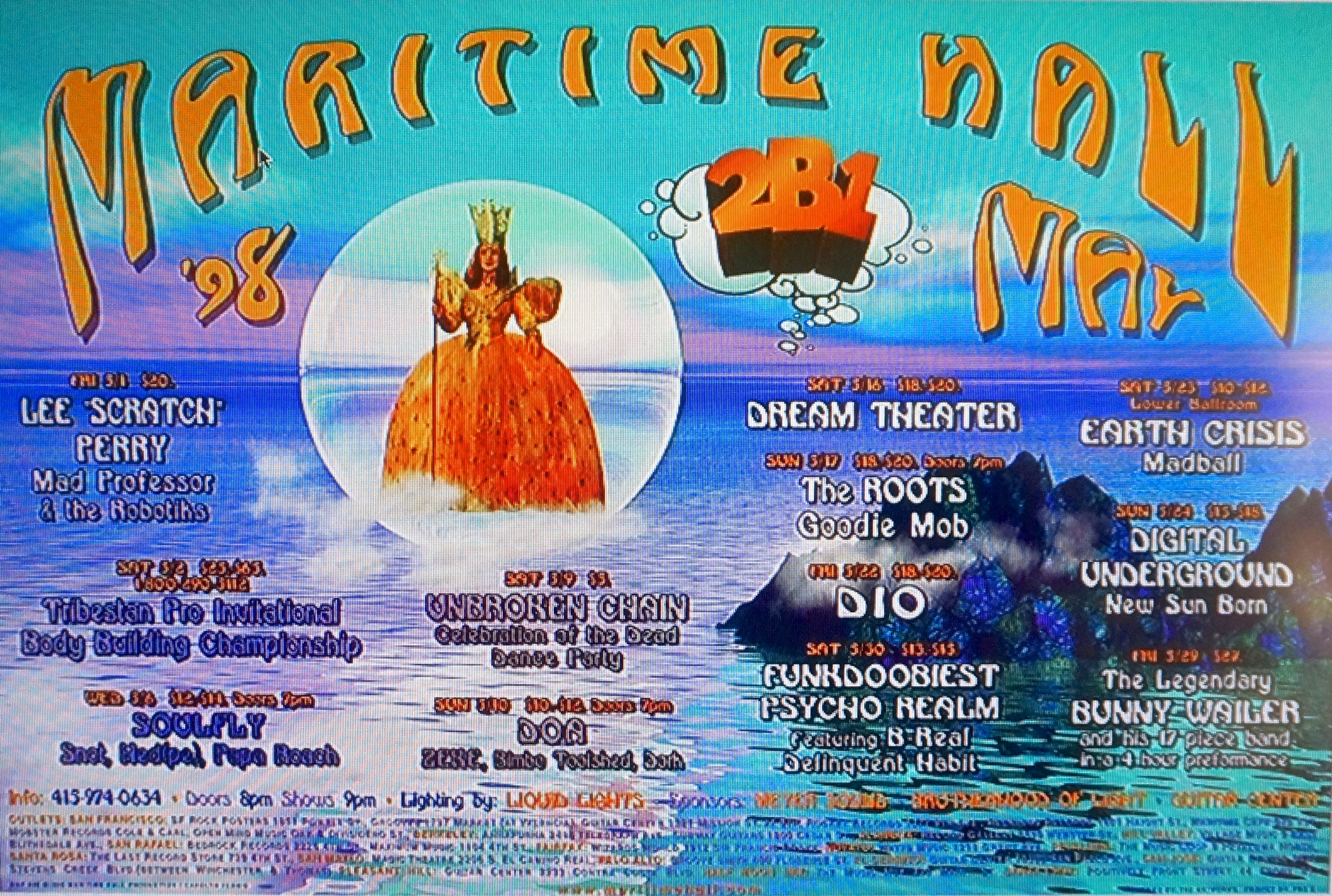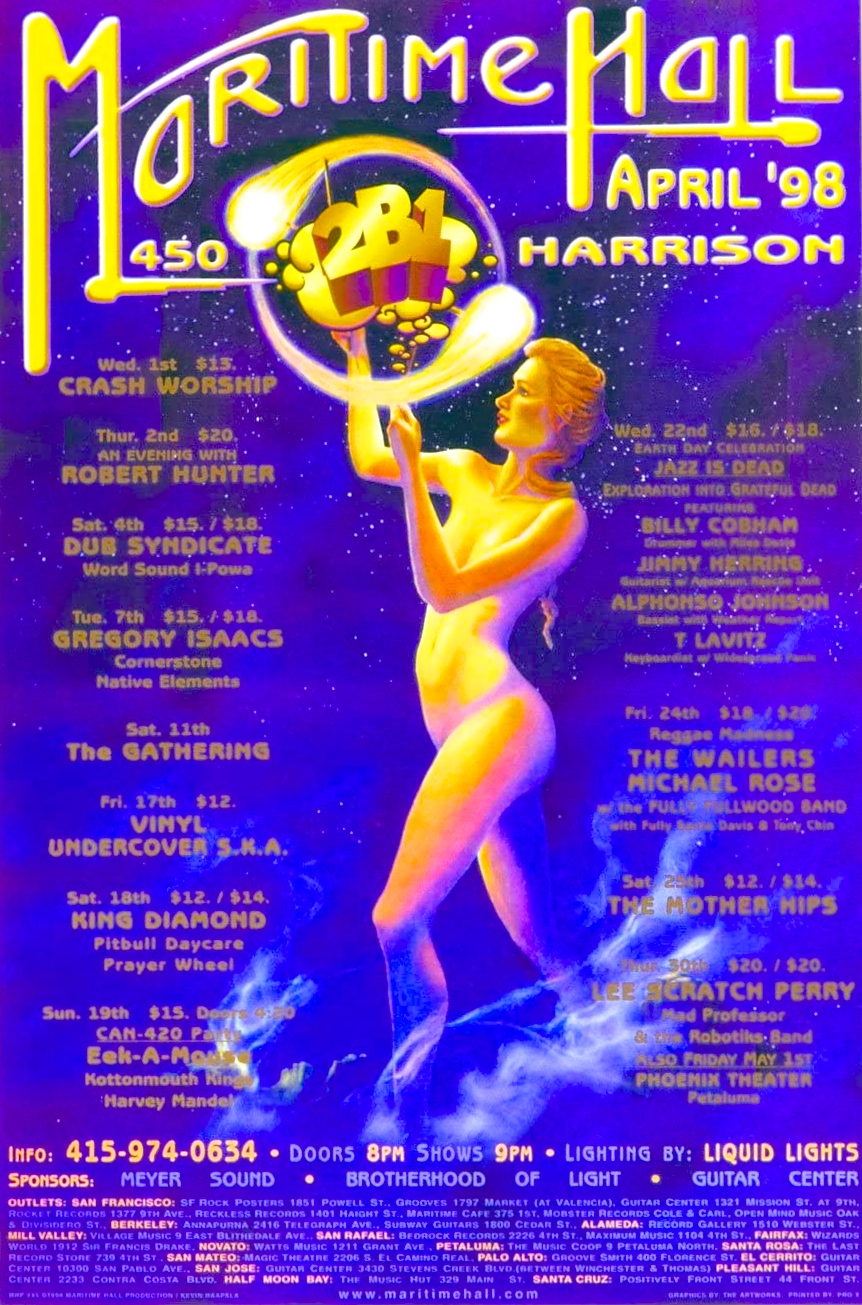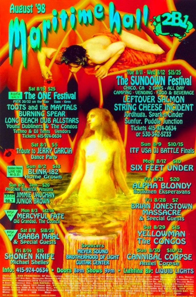 Happy New Year! It felt good to put the marathon year of ’97 behind me and though ’98 had slightly fewer shows to write about, I still have around 160 to hash out. I say around because I’m still discovering new ones from time to time that I didn’t record, plain forgot about, or was unsure which show I was at on a particular night in question. It was a busy time. This would be the last complete year I would serve out at the Maritime as my and my partner Pete’s relationship with the Hall’s tyrannical owner, Boots, would gradually become intolerable. But Pete and I wouldn’t have parted ways with the Hall full time until the end of ’99 and I would go in and substitute for our replacement, Wade until the Hall’s final sinking in early 2001. So, until then, I’ve got plenty to write about, so let’s get started.