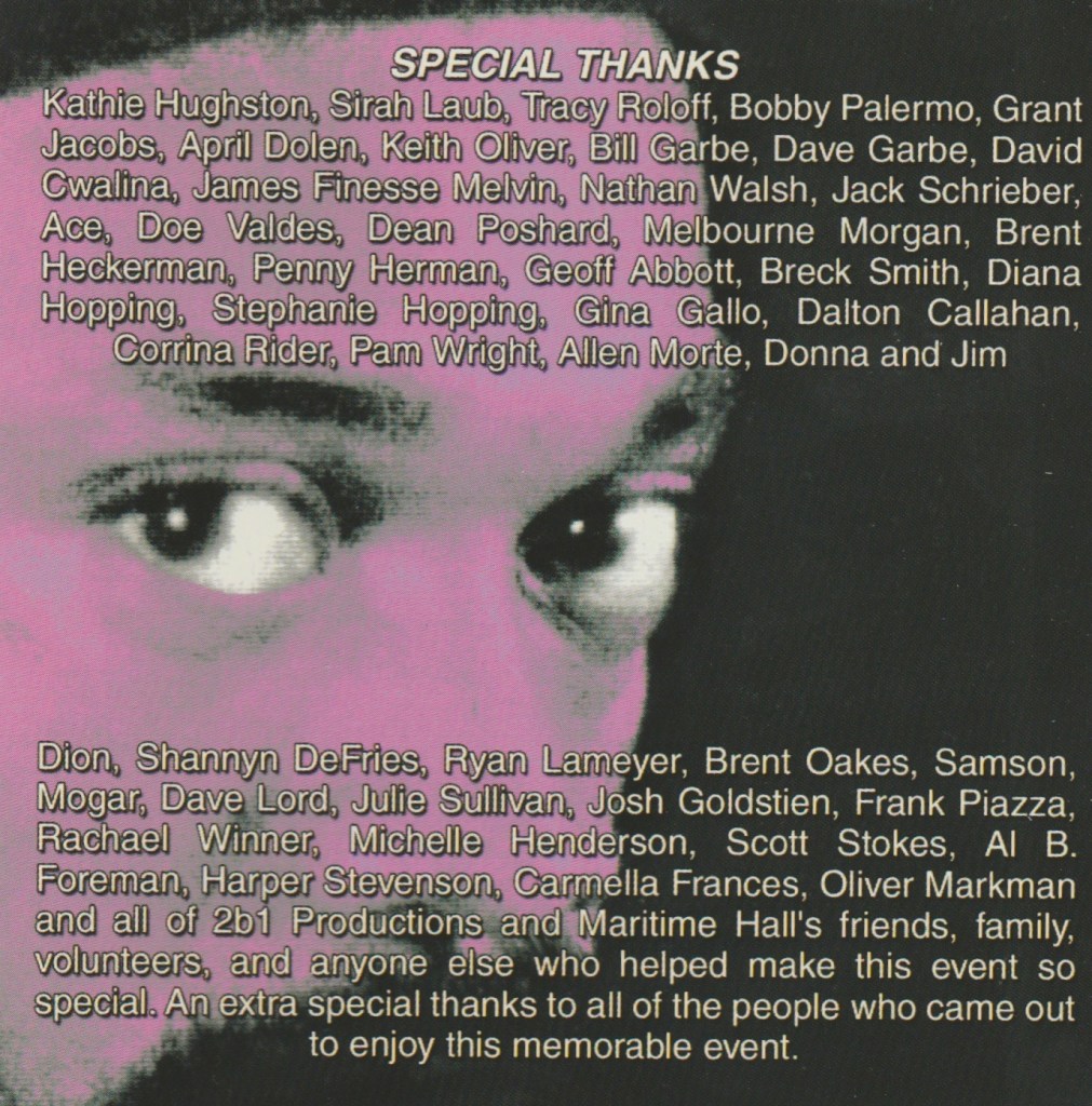 Even more people came on stage to dance to “Blue Flowers” including a rather weird , skinny, young white guy who had dressed his T-shirt over his scalp like an Egyptian pharaoh. Keith said it was a song about some “acid shit” and for folks who were into “different things” and who “know their pills”. Maybe the white guy was on some of those, because his dance moves were downright bizarre, even doing a hand stand for a moment. Ice-T seemed a little miffed by him, but went along with it saying, “This music is for him! Now do you understand?” During one of the freestyle sessions, Keith made fun of Money B from the Digital Underground on stage, patting his belly rapping, “Yo, Money B, fat stomach G”, cracking them both up. It was a wild show and I made it a point to see Keith each and every time he’d show up to the bay area, even the shows he’d ultimately bail on. Luckily, he always made it to the shows he’d do at the Maritime and when he came back in 1999, footage from that show would go on to be used in the bonus features of the DVD he’d have released from the gig he did at the Mezzanine in 2006. Pity that none of the footage from this show was used though. It was quite a night.