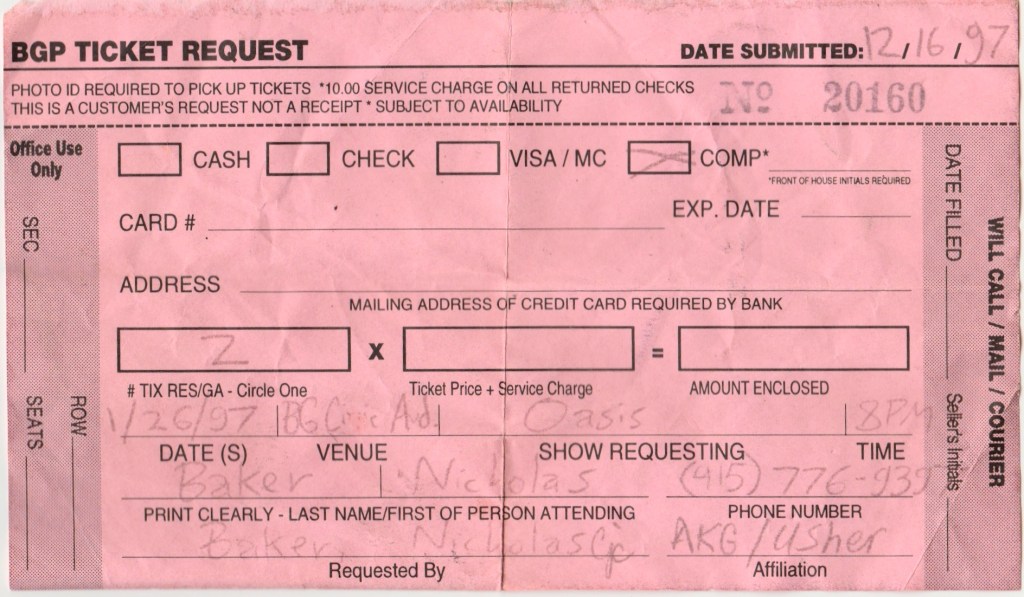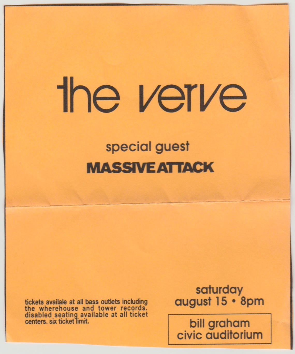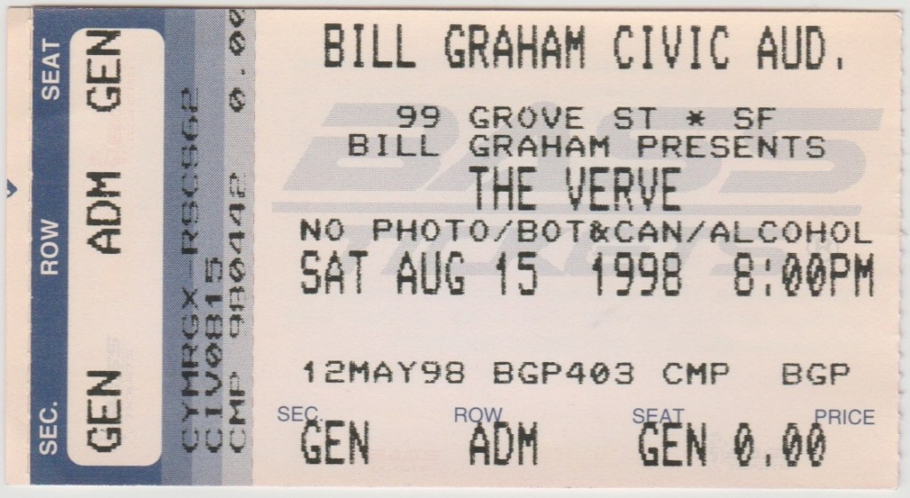 The brothers Gallagher were back in town again and they’d brought Cornershop with them, an inspired combination in my opinion. I’d seen Oasis only six months before opening for U2 in Oakland at a very long distance away on the stadium’s third deck and was eager to see them headline their own show for the first time and get just a wee bit closer look at them. They had done a show at The Fillmore back in ’95, but I had to miss it for some reason. It wasn’t another show. I checked the list. The usher list probably filled up before I got a chance. Anyway, the bad boys from Britain were coming near to the end of the very long “Be Here Now” tour starting the previous May and would keep going for another month. By this time Noel and Liam were pretty wasted and really, really, really not getting along. But they got through the show without fighting, though Liam taunted the fans in the balcony for being “fat slobs”.