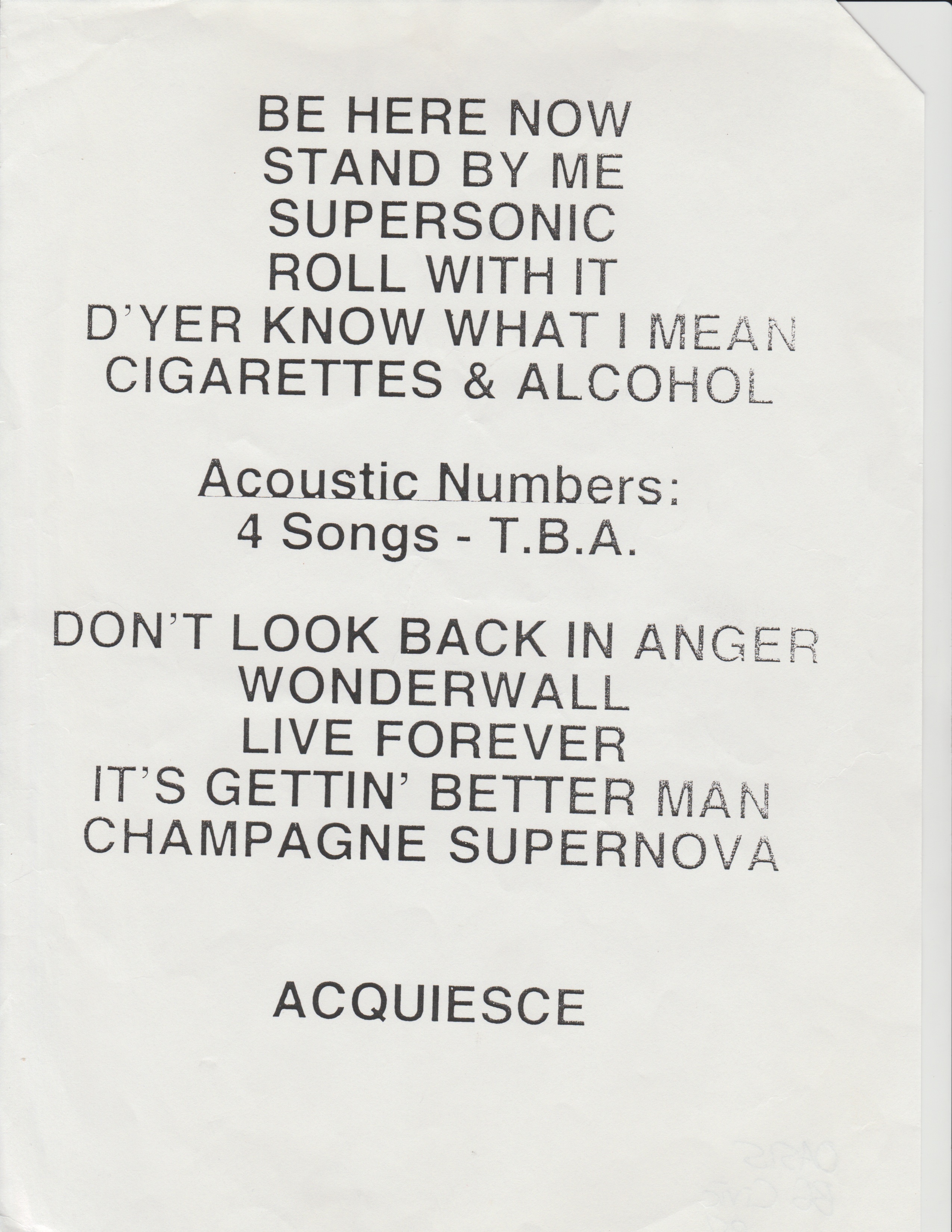 (OASIS) : Be Here Now, Stand By Me, Supersonic, Roll With It, D’You Know What I Mean?, Cigarettes & Alcohol, Don’t Go Away, Talk Tonight, Help!, Whatever, Don’t Look Back In Anger – All The Young Dudes, Wonderwall, Live Forever, It’s Gettin’ Better (Man!!!), Champagne Supernova, Acquiesce