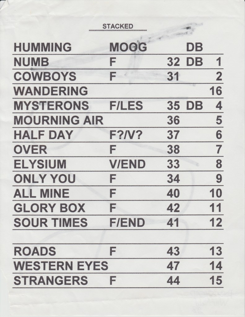 (DEPECHE MODE) : Question Of Time, World In My Eyes, Policy Of Truth, It’s No Good, Never Let Me Down Again, Walking In My Shoes, Only When I Love Myself, Question Of Lust, Home, Condemnation, In Your Room, Useless, Enjoy The Silence, Personal Jesus, Barrel Of A Gun, (encore), Somebody, Behind The Wheel, I Feel You, (encore), Just Can’t Get Enough