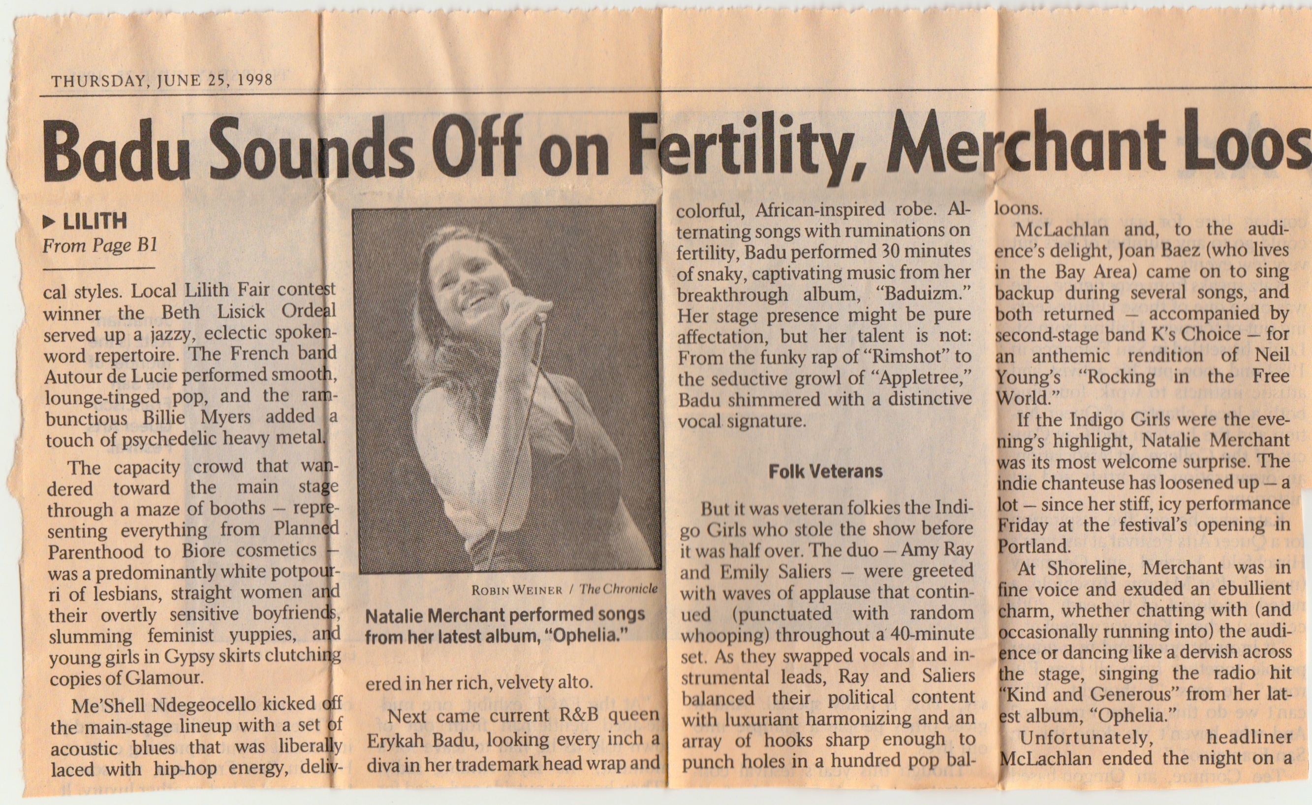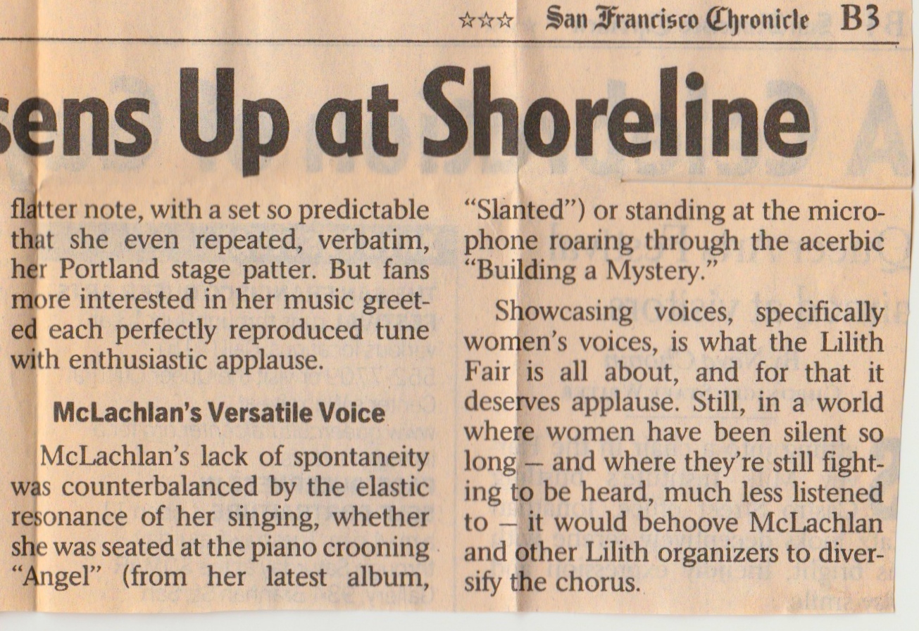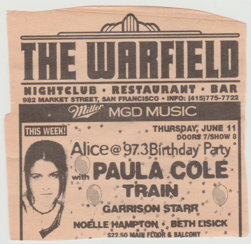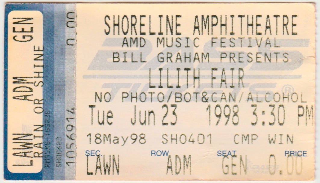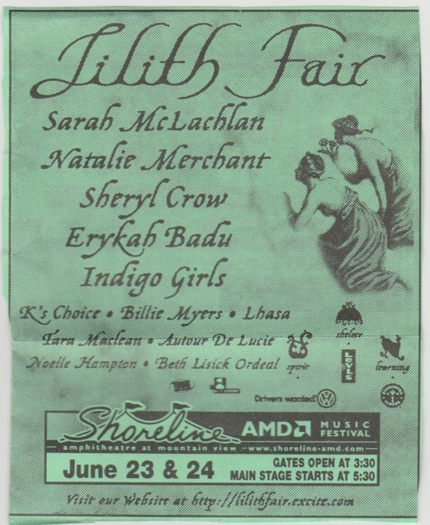 This was the second of a two night stint at The Warfield and they being the lesbian and feminist icons they had risen to, there was no problem filling the place, especially it being San Francisco, and naturally the lines to the men’s rooms were remarkably sparse. I had a sticker badge from the night, so I must have worked the whole show, but it being a civilized acoustic show, it was easy. Once they started, people stood transfixed in their spots, not even moving, much less dancing. Not to say they weren’t enthusiastic, quite the opposite. Indigo Girls fans are committed, singing and clapping along to songs like “Least Complicated” and “Galileo”. They did a couple covers including Pink Floyd’s “Wish You Were Here”, which made me tear up and still does as I will always associate that song with the death of my friend Casey, who had just been killed on his bike less than five months before this show. On a happier note, they also covered “Blister In The Sun” by the Violent Femmes which was surprising actually in its selection and borderline punkishness. I’d see the Indigo Girls one more time that year when they joined Sarah McLachlan on her Lillith Tour at Shoreline, but that would be the last time I’d see them.