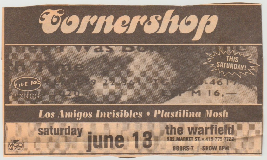 Though I really enjoyed Molotov’s rowdy set, I was particularly impressed by the opening act, Ozomatli, and I dare say that they even stole the show a little. Their name is a Nahuatl word from their astrological symbol of the monkey, which also serves as a god of dance, fire, the new harvest, and music. They were brand new back then, having just released their debut self-titled album that June. Ozomatli had been a bunch of guys trying to organize a worker’s union in L.A. before that who didn’t receive recognition, but were given the the lease of an abandoned building for one month in consolation. There they formed this band and before you know it, they were touring with everybody, even Carlos Santana. In fact, they had just played The Fillmore two nights before this opening for Los Lobos, a show I’d have liked to have seen, but was working across town at the Maritime recording The Black Crowes.