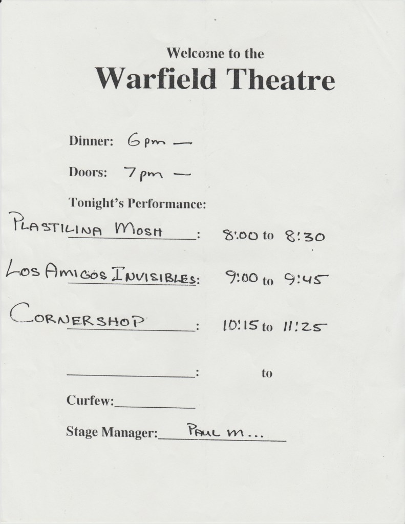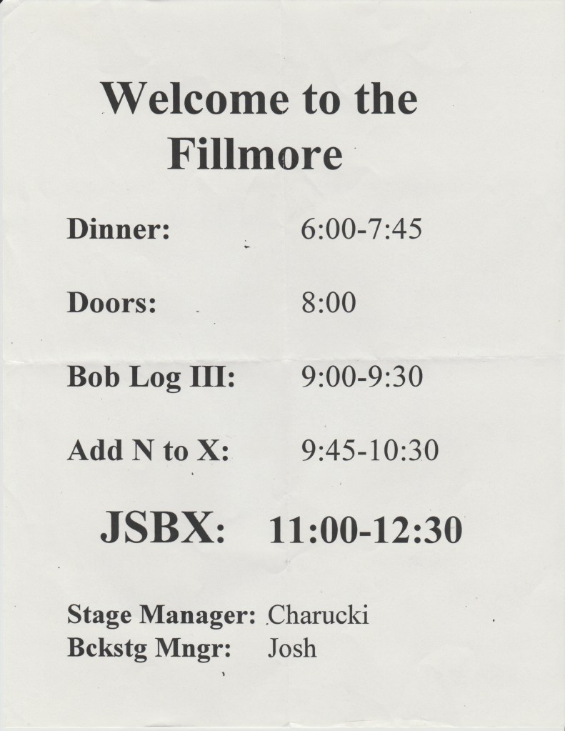 Putting the future tragedy aside, it was good to be back at the Hall again after having a couple weeks off after the New Years show with Toots & The Maytals. Pete was confident enough in my skills by this time to leave me at the helm of the recording room alone regularly and I had the honor of getting to tape the first two shows of the year myself. Lord knows, I had time on my hands having been unceremoniously let go from my AV job at the Marriott only a little over a month before this show, but I’d soon bounce back, beginning to work for the stagehands union. I’d take my first call with them that February and I’ve been with them ever since, though working with them and reconciling my schedule with the Hall and ushering proved to be dicey, at least until the Maritime folded, but that’s another story which I will get to when we get there. This night was a rowdy one and loud as hell and it was good practice to get back mixing full rock bands again after having not been at the the helm of the recording room without Pete since the previous November with the Brian Jonestown Massacre. The Electronica Hanakkuh a week after that didn’t really count as mixing since I had only two tracks and the audience mics to wrangle that evening.