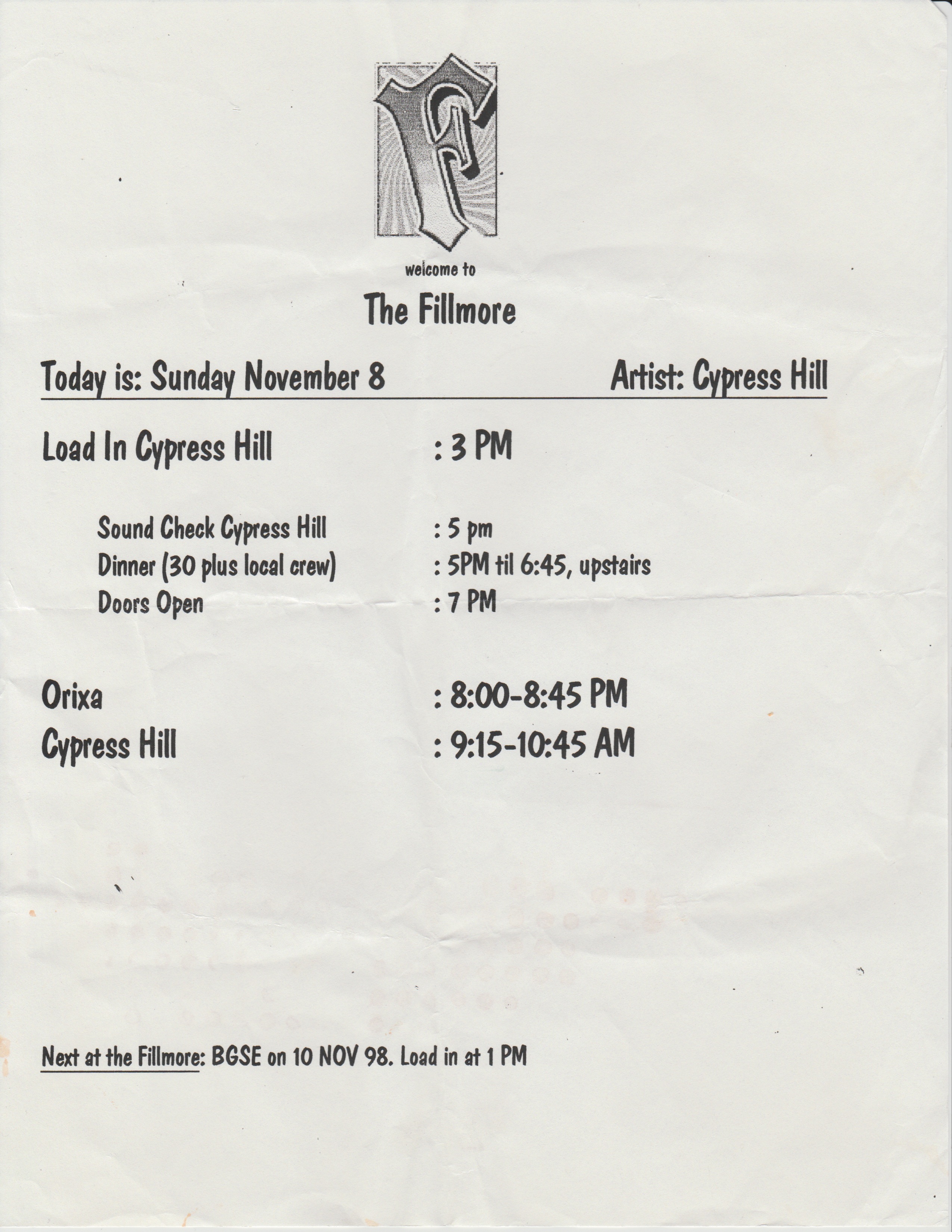 My hip hop education continued that night with the perpetually baked, dynamic duo of Redman and Method Man. Redman had a brilliant show at the Hall before in June of 1997 with The Alkaholiks, but this was the first time Method Man was in house. His fellow Wu Tang Clan compatriot, Ol’ Dirty Bastard, had performed that July, making this the second of that legendary rap group that I would have the pleasure and honor of recording. GZA would also eventually play at the Hall in July of 1999 and later Ghostface Killa would too, but I wasn’t at that one. We had no video crew to speak of this gig, so I just set a wide shot up in the balcony and that was it. There were just DJs opening, so it was an easy mix and their set that night was just a hair under forty minutes, so I didn’t have to work too late. The show was announced too late to make it to the monthly poster.