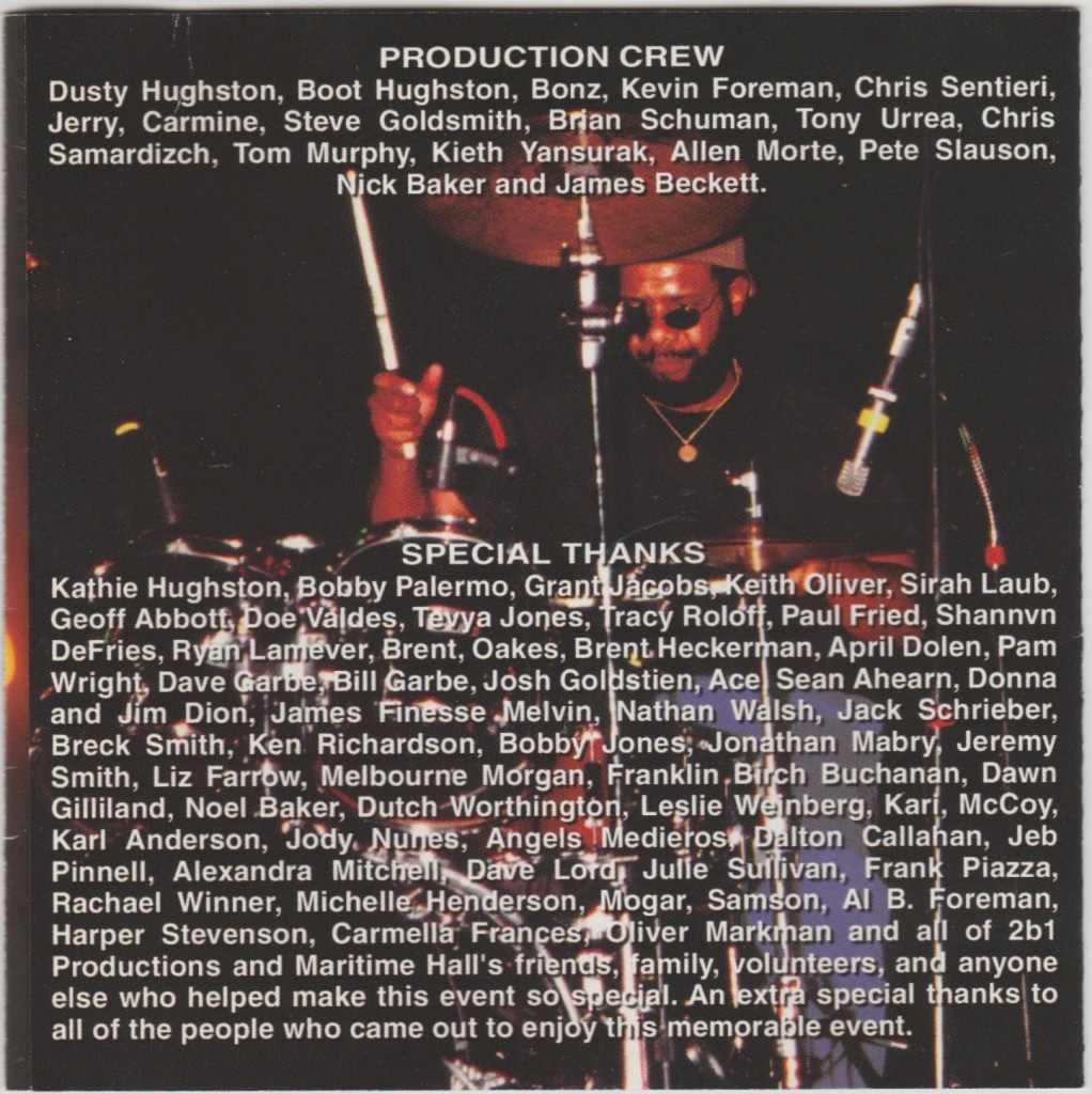 Oh yes, I knew Merl quite well by this New Year’s, but at this show there would be one critical difference. Merl would have none other than THE Bill Kreutzman from the Grateful Dead playing drums for him in this “Funky Friends” band instead of his usual Rainforest Band. I saw Bill with his wife in the stairway during Toots’ set and I shook his hand saying what an honor it was to record him and have him there that night. He was polite, quiet, and gracious about it. Seemed like a nice guy for that brief moment we shared together. Bill had collaborated with Merl that year on his album, “Fiesta Amazonica”, which was a collection of unreleased tracks they recorded together at Fantasy Records. For that project, Merl employed a young singer from Bulgaria named Mariana and I believe she was there performing that night as well.
