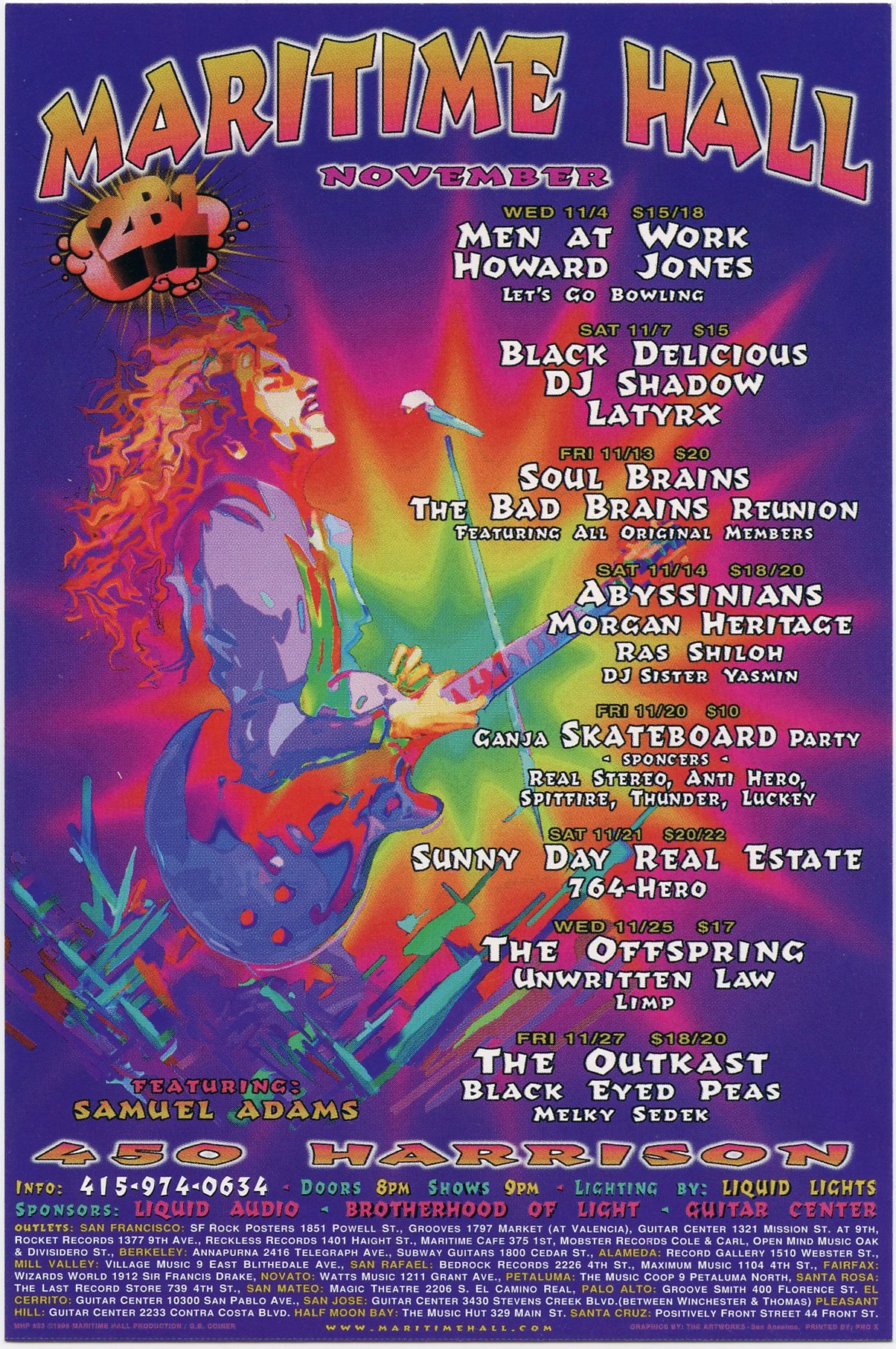 The “dirty south” hip hop scene was just getting its legs around this time and Outkast was riding high on the crest of that wave. Along with fellow Georgia natives the Goodie Mob and other acts like Nappy Roots, they were showing the world that hip hop wasn’t necessarily limited to New York or California. Outkast was still pretty new then at least to people out on the west coast, having only released their second and most recent album, “ATLiens” in 1996. Their third album, “Aquemini” would be released that September, but they didn’t play any new songs from it at this gig. But despite being new, they had no problem packing the house, even when the show was announced at such short notice that it didn’t even make it to the Maritime’s monthly poster. Andre Benjamin introduced himself by his normal name, instead of “Andre 3000”, that night nor wasn’t dressed like a Martian or some wigged pimp from the 1970s as he would do regularly in the years to come. In fact, apart from the colorful wool knit beanie hat he wore, he dressed rather informally. He was representing Atlanta baseball though, wearing a blue satin Braves jacket, but he took it off after a couple songs.
