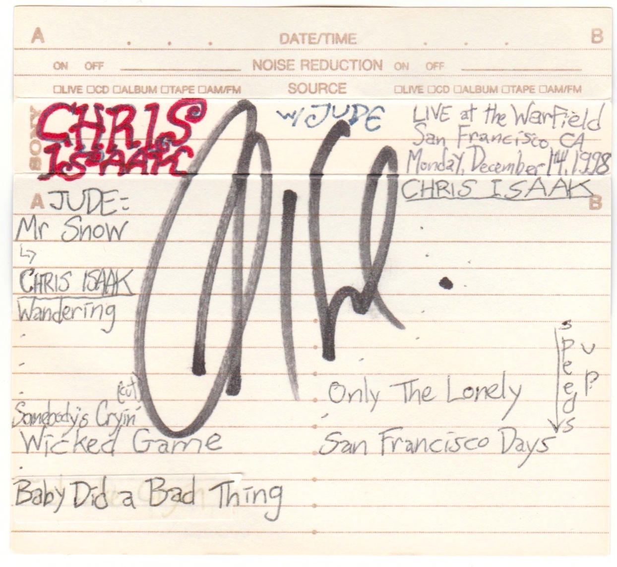 It had been three long years since Chris had played the Warfield, also in December and somehow it felt right for him to play there around Christmas. Maybe it’s just all the fancy outfits he wears on stage that fills us with holiday cheer. He had just put out his seventh studio album, “Speak Of The Devil”, that September and we were lucky to hear six of the new songs that night as well as “Go Walking Down There”, which wouldn’t be released until ten years later on his “Forever Blue” album. There was a young man named Jude opening that night and I thought him quite a brave soul to take the stage at such a large venue solo, just him and his guitar. He did fine, serenading us with his high pitched voice, singing his songs, though one of his tunes had a smidgen of John Mellencamp’s “Jack & Diane” in it. In the holiday spirit, he also did a bit of the “Snow Miser Song” before doing one of his own at the end of his set.