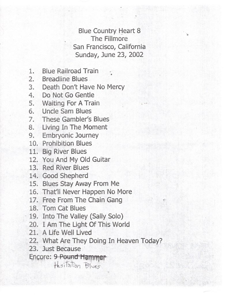 SETLIST : Blue Railroad Train, Breadline Blues, Death Have No Mercy, Do Not Go Gentle, Waiting For A Train, Uncle Sam Blues, These Gambler’s Blues, Living In The Moment, Embryonic Journey, Prohibition Blues, Big River Blues, You & My Old Guitar, Red River Blues, Good Shepherd, Blues Stay Away From Me, That’ll Never Happen No More, Free From The Chain Gang, Tom Cat Blues, Into The Valley, I Am The Light Of This World, A Life Well Lived, What Are They Doing In Heaven Today?, Just Because (encore), Hesitation Blues