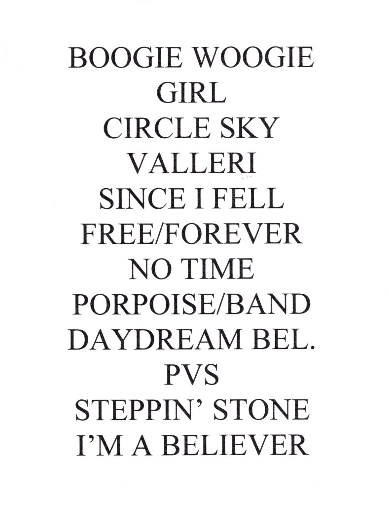 (THE MONKEES) : Overture, Last Train To Clarksville, A little Bit Me, The Girl That I Knew Somewhere, Randy Scrouse, Mary Mary, Goin’ Down, Nice To Be With, Monkees Theme (Foreign Versions), You & I, That Was Then This Is Now, Different Drum, Boogie Woogie Bugle Boy, Girl, Circle Sky, Valleri, Since I Fell, Here Comes Tomorrow (Free Forever), No Time, The Porpoise, Listen To The Band, Daydream Believer, Pleasant Valley Sunday, Stepping Stone, I’m A Believer