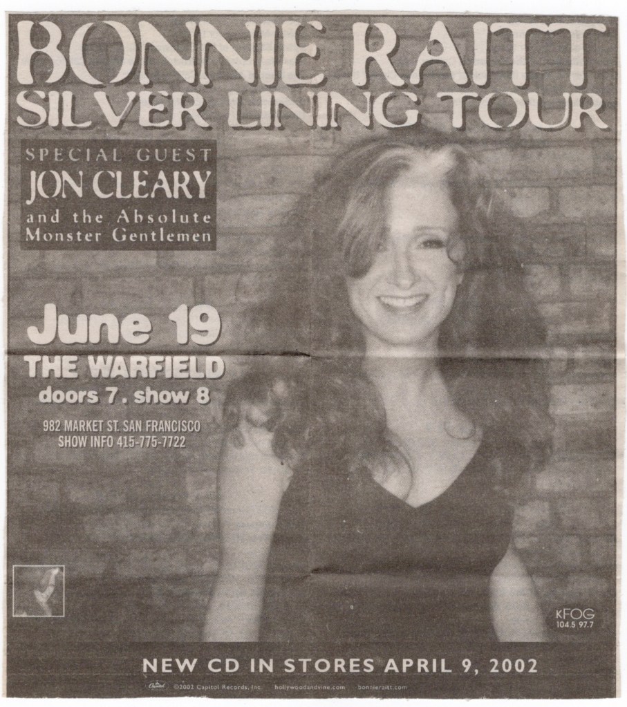 I hadn’t seen her play in six years, but she still looked and sounded great. Anybody with eyes would have a crush on her, but she recently came off the market, getting got married in 1999. I am happy to say that she was inducted into the Rock & Roll Hall Of Fame two years before this show as well. If that wasn’t enough, she had just got a star on the Hollywood Walk Of Fame to boot. Good for her. She deserved one. And on an uplifting note, Bonnie had also just become an official supporter of Little Kids Rock, a non-profit organization that provides free musical instruments and lessons to kids in public schools. She continues to be on their board of directors and well as being an honorary member. Bonnie, in fact, had been recently rehearsing in the new sound studio of my friend and former Maritime Hall partner, Pete Slauson. They were old friends from the North Bay hippie days of yesteryear. Though when I visited Pete at his studio around that time, I never saw Bonnie there, but I remember Pete pointing out to me a towering stack of CDs that she had given him of her work. No kidding, the stack must have been at least two feet tall.