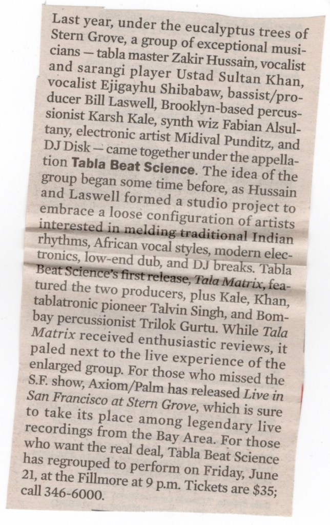 This group was brand new, but had actually been in town the year before sharing their debut performance at Stern Grove. They took the recording from that show and made a live album from it, rereleasing it as a double album earlier the next year. Talvin Singh had been in the band then on tablas, but he wasn’t touring with them this time. This show was sponsored by KPFA and The Phoenix Hotel, a popular and fashionable place for bands to stay in town which was just a few blocks from where I lived then in The Tenderloin. Tabla Beat Science would also go on to play at the Sierra Nevada World Music Festival the next day and then the Montreal Jazz Festival the week after. Somebody from the aforementioned radio station came out to introduce the band and somebody in the crowd shouted to him, “You rock!” for which he replied, “I paid him $50 to do that”. He then praised the band, calling them “well respected” and some of “the best musicians of our time”.