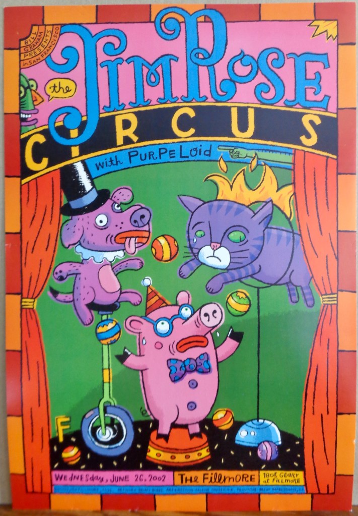 Jorma got on soon enough and I was cut from ushering. His material was pretty quiet actually, so my recording was a bit faint, but everybody in the audience was silent as the grave. His songs, a wide collection of covers, originals, and instrumentals, reminded me a bit of that “western swing” sound by Dan Hicks and his old band The Charlatans. That sort of ragtime sound always felt strangely apropos to San Francisco. Maybe it’s all the Victorian houses still around. Plenty of blues numbers were played as well with eight songs alone having “Blues” in the song’s title. He and his bandmates played for quite a stretch that night, well over two hours, and so much so that my tapes ran out near the end, making me miss his last six songs and the encore. I stuck around to the end anyway and was pissed to discover that there was no poster. You’d think such hippie royalty would have warranted one. Anyway, perhaps the antithesis of hippies, The Jim Rose Circus, would grace the same stage three nights later and at least they would get a poster.