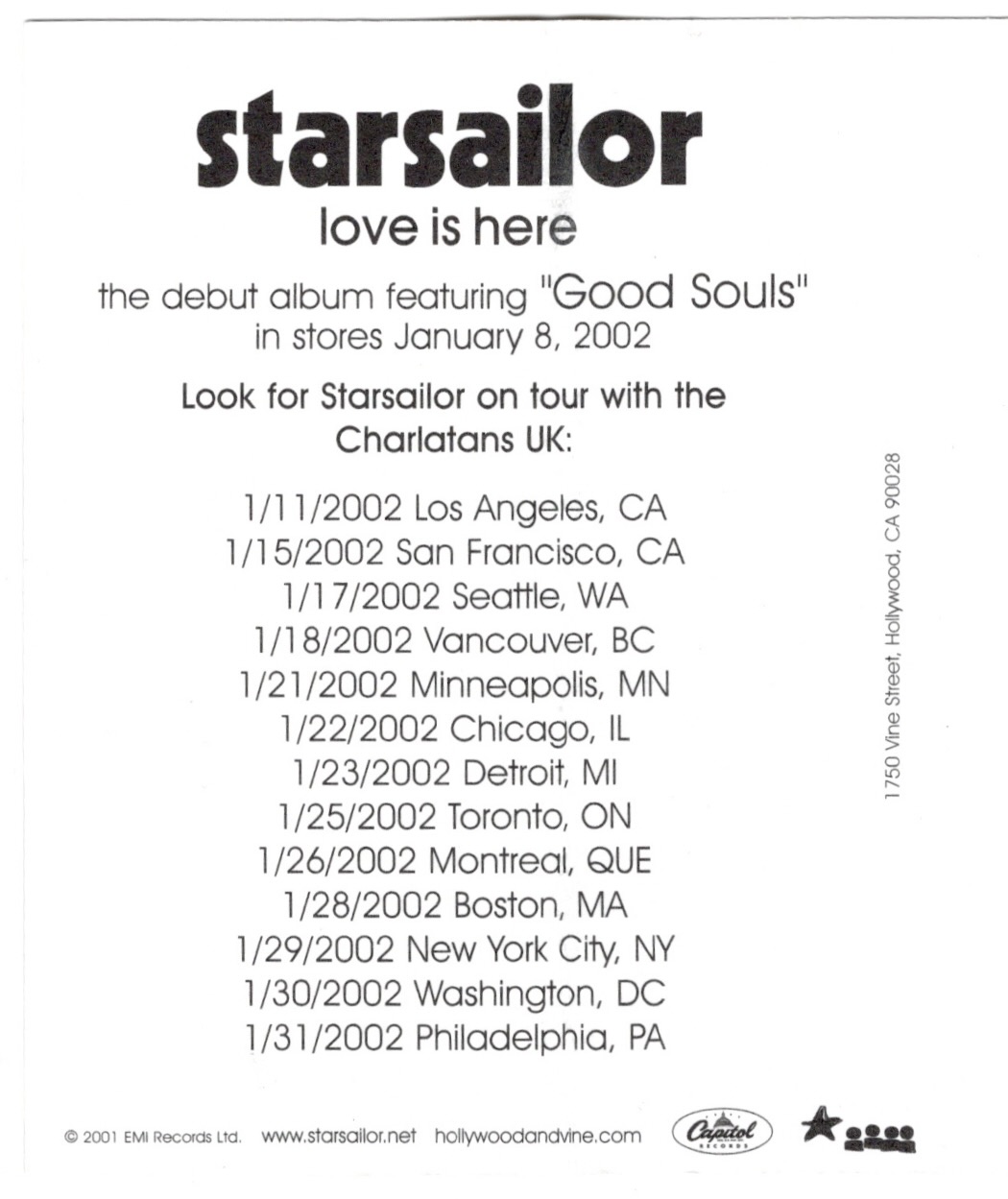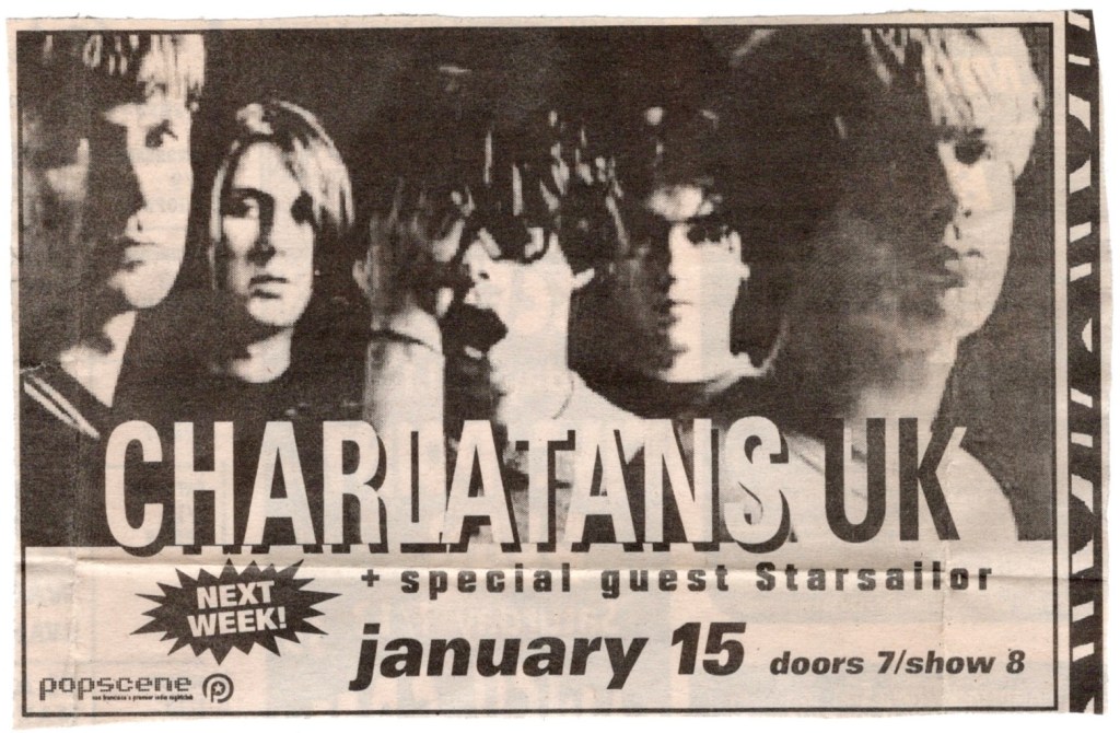 That being said, though I was familiar with the younger Charlatans, this would be the first and only time I’d be seeing them perform live. Hailing from the Midlands/Northwich area near Manchester where many Britpop bands had been hatched, The Charlatans UK had been making music for years, going through a few line up changes, and had just released their “Wonderland” album the previous September. They had recorded it just down the road in L.A., ingesting so much cocaine in the process that their dealer had shacked up with them, taking residence on their sofa. The Charlatans UK would also release “Songs From The Other Side” later that year, a collection of live tracks and B-sides. Though I had seen many of their contemporaries during that time, like I said, this would be the only occasion that I would see The Charlatans UK perform live, as well as their opening act that night, Starsailor, though they both still continue to make music and tour.