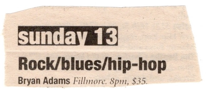 Bryan Adams, Fillmore, SF, Sun., January 13