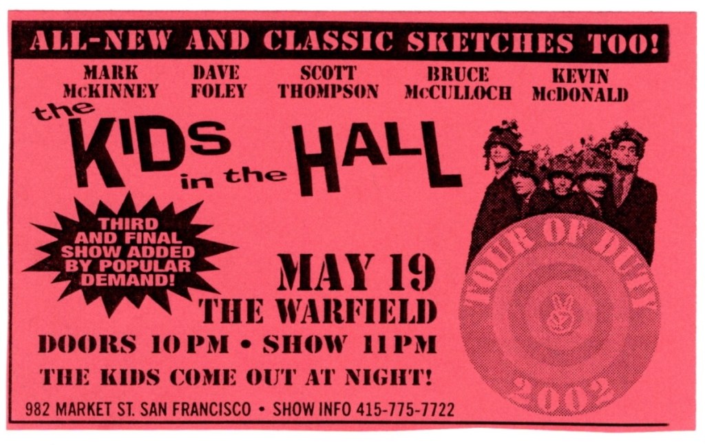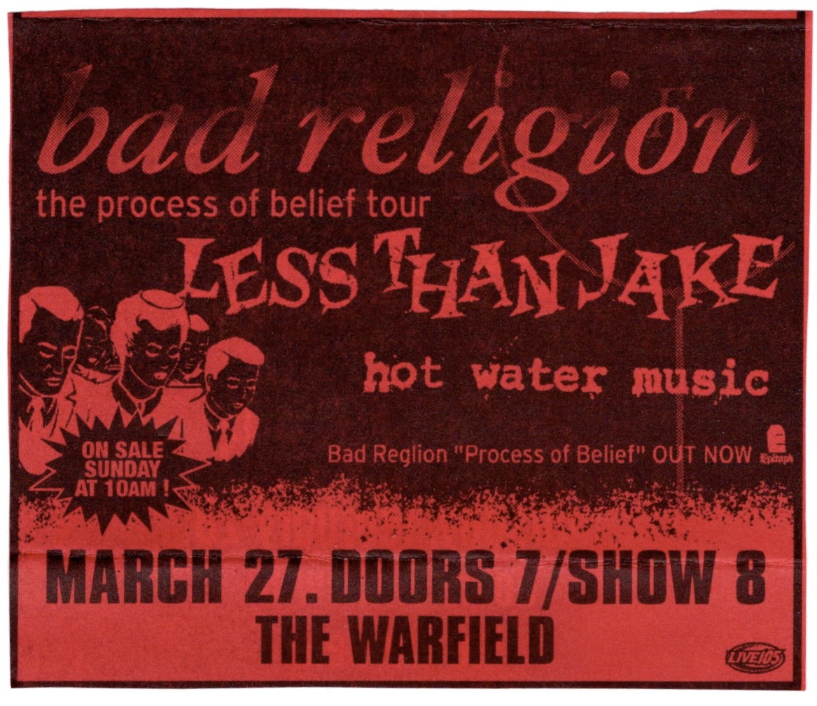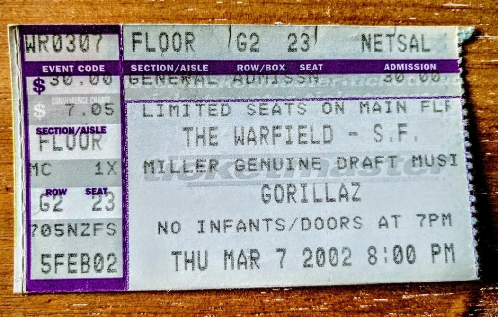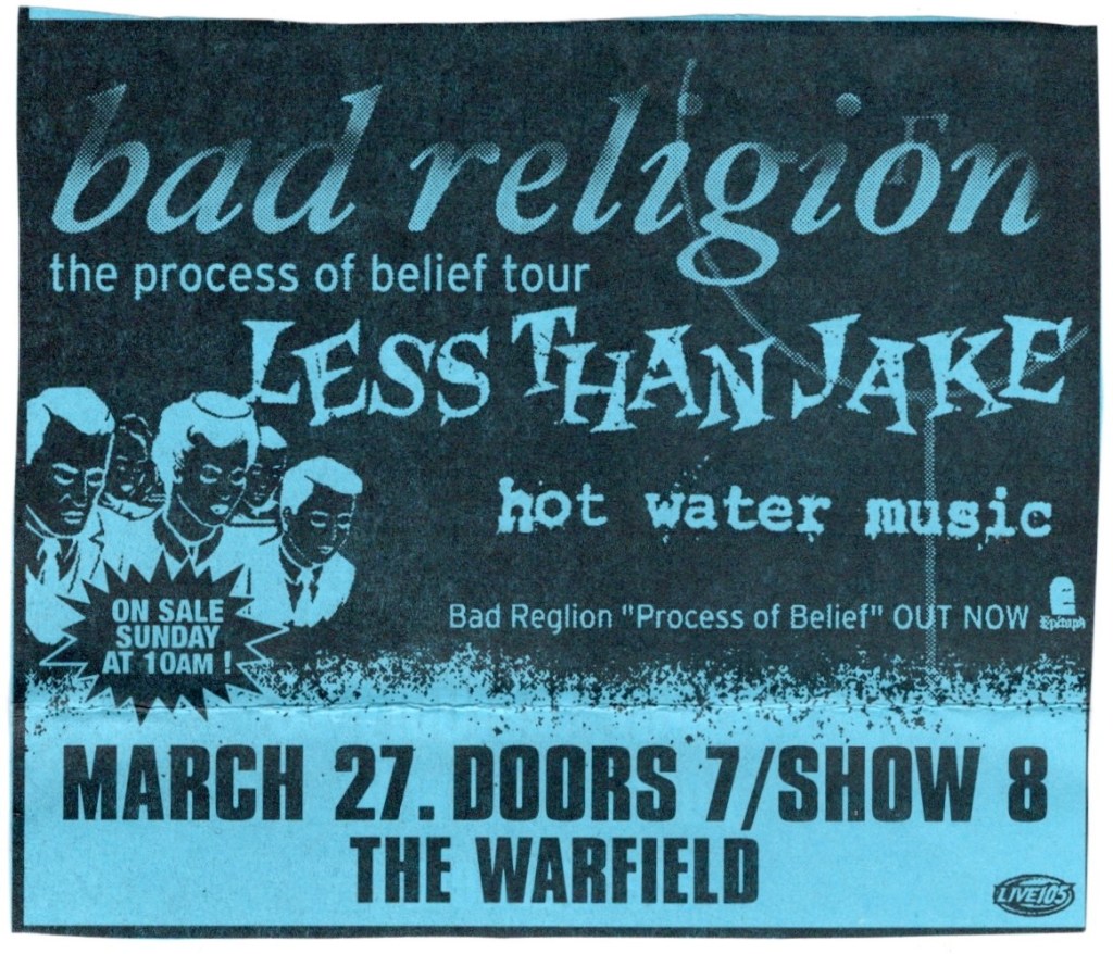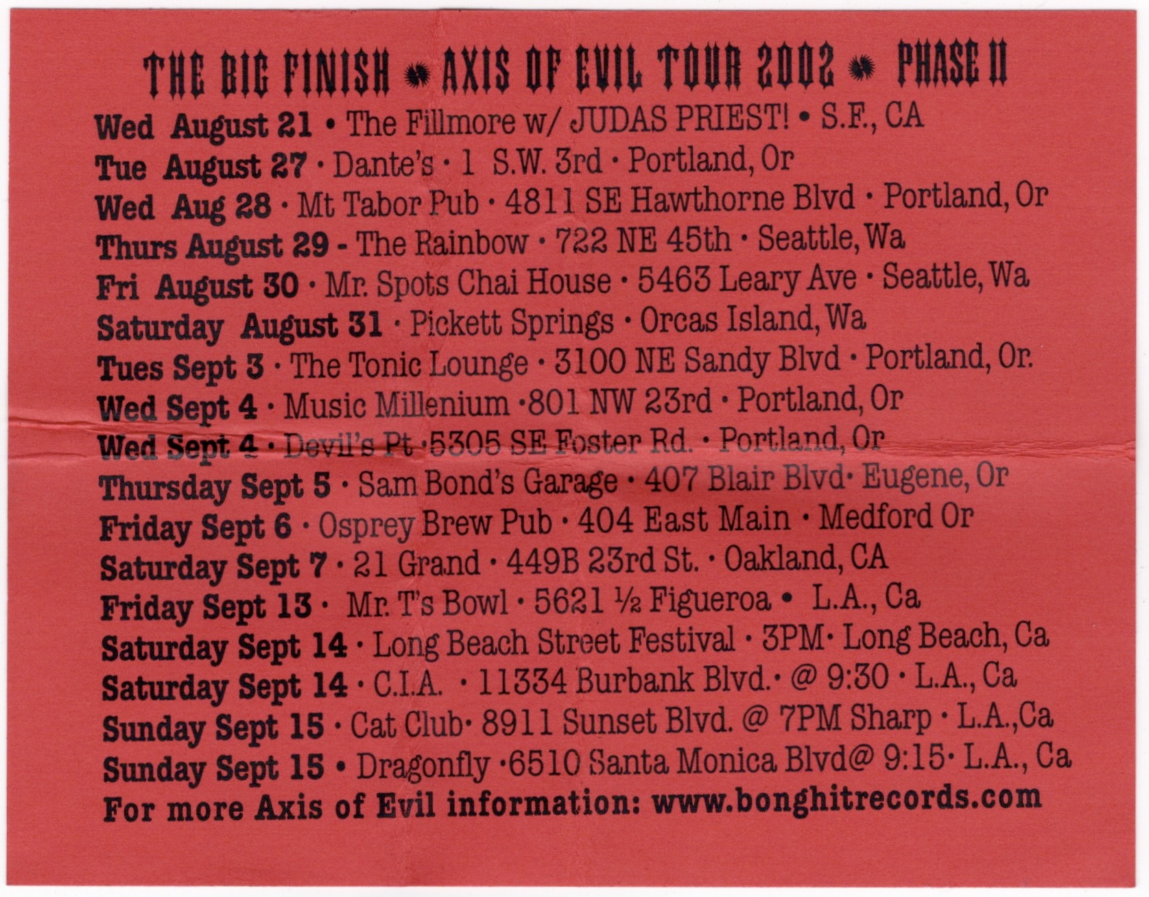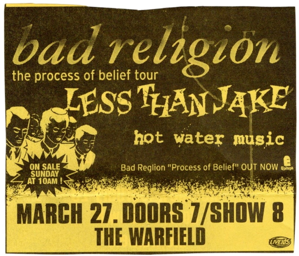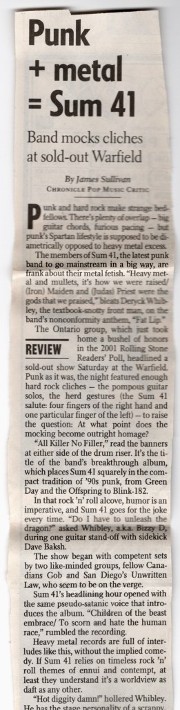 Everybody sang along to the breakdown in the middle of “Fat Lip”, the line “Don’t count on me” echoing loudly in the house. They came back for an encore, the first song I didn’t recognize, but I know they finished with “Pain For Pleasure”. The story goes that Steve wrote it in only ten minutes while sitting on the toilet, an homage to another famous metal band, Iron Maiden. Sum 41 left the stage to the sound of their fans chanting, “We want more!”, but that was it. There was a great poster given out as we left done by Chris Shaw, one of my favorite poster artists. Sum 41 would continue their success after this show, performing on “Saturday Night Live” that April and I would see them return to the Warfield stage in 2003, followed by an appearance at the Warped Tour that summer at Pier/30/32.