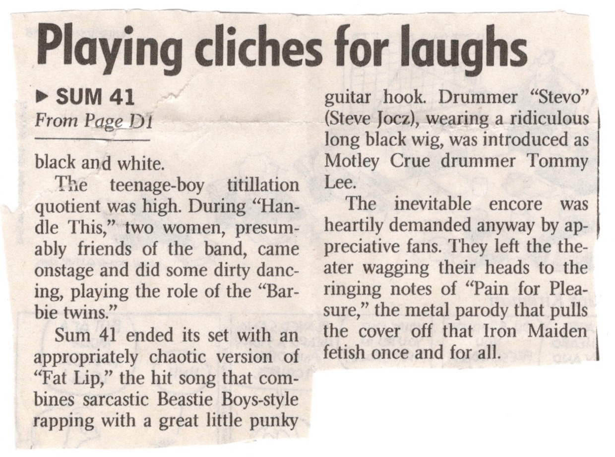 The next band on the bill was Unwritten Law, a band I’d seen open for a couple others by then, including once for Bad Religion on that stage in 1996. They didn’t talk nearly as much as Gob, but they played a solid set as usual, even doing a little bit of “Waiting Room” by Fugazi in the middle of their song, “Lonesome”. I’ve always liked Unwritten Law, but I’m pretty sure this was the last time I saw them perform live, though they continue to make music to this day. The same goes for Gob. But the night belonged to Sum 41 and their ear piercing shrieks of all the young women in the audience when the got on stage confirmed it. Everyone up front was putting up their Sum 41 salute, raising four fingers on one hand and one on the other. Their entrance was accompanied by a rather disturbing introduction over the speakers, some satanic thing ordering the “children of the beast” to “scorn and hate the human race” before they opened their set with “Motivation”.