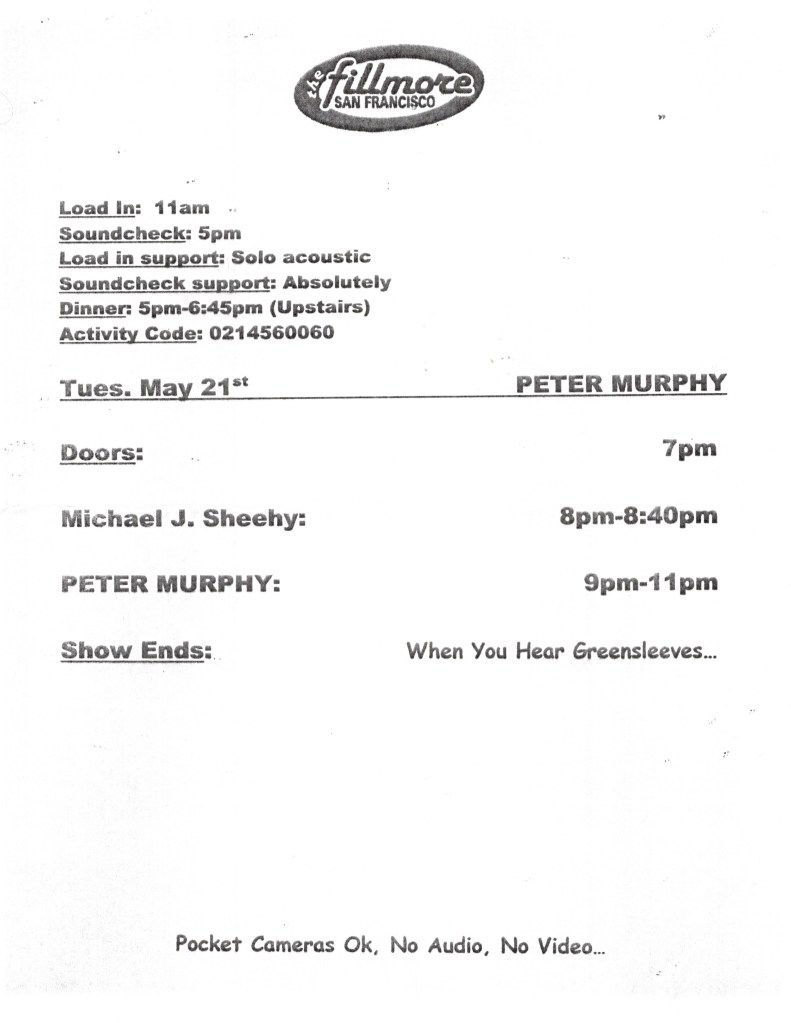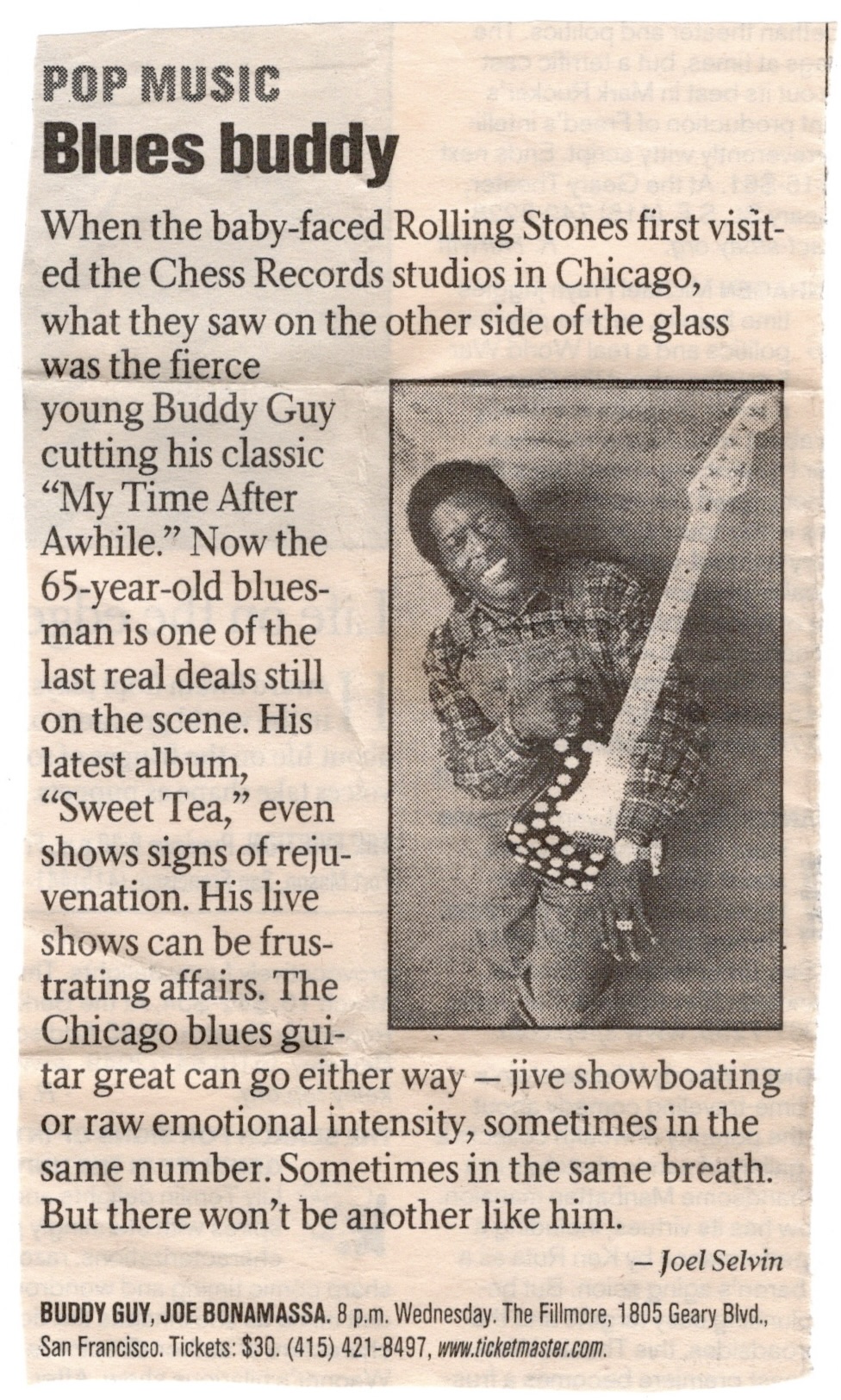 The previous May, Buddy had just released his “Sweet Tea” album, the 11th of his studio outings, and it would go on to earn him a Grammy nomination for Best Contemporary Blues Album. With his skills and history with The Fillmore, one would think that they’d have sprung for a poster to mark the occasion, but alas, there wasn’t one. The show might have been drummed up at the last minute which would explain its lack of fanfare. In a strange coincidence, my friend and mentor Frank Gallagher who I work alongside in the stagehands union, had toured for years doing sound for Buddy, but had also toured with the Talking Heads in the 80’s and I would see David Byrne, the eccentric frontman of that band, on that very stage only five days later.