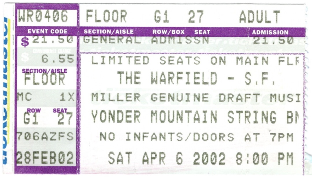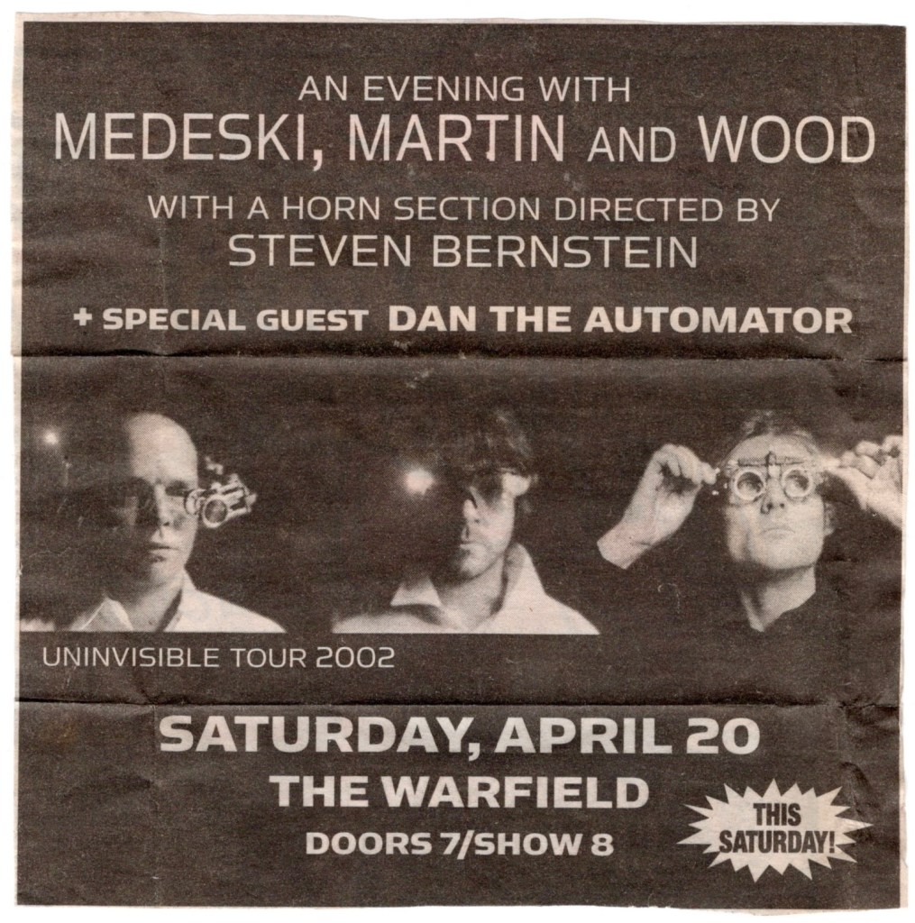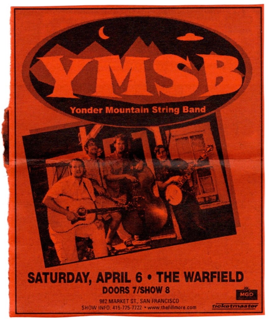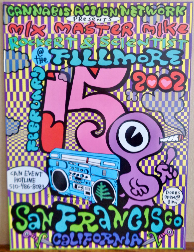 Veteran hippie keyboardist Pete Sears manned the keys and none other than his obnoxious self, the ugliest man in rock & roll, fellow Zero bandmate Martin Fiero was there with his tenor sax. It was just an evening with Mr. Kimock, but he did two sets, so I had to work through the first one and wait out the set break and the first couple songs of the second set before I was set free from my ushering duties. The usual armada of hippie tapers guys were there nestled into their section next to the front of house sound board, so I’m happy to report that I was able to find a quality recording of that evening on archive.org. They had a DJ with the clever name of DJ Toby-Wan spinning records in the beginning and later during the set break. Incidentally, Toby-Wan would also be playing alongside Steve at The Fillmore at the aforementioned gig a year after this one.