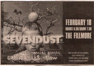 Soil, or SOiL as they like to spell it, had a little more success engaging the machismo mob and whose singer, Ryan McCombs, was slightly easier to understand than the last guy. They were pretty tight actually. After they did “Wide Open”, he said, “Hey San Francisco! This is a good place to start this tour out I believe. You guys ready for Soulfly?!?… for Static X?!? Let’s get those motors running high man because they going to want it from all you guys!!!”. A couple songs later, he thanked the bands saying, “There’s not a single band who takes the stage tonight to do what we do without you people showing up and give us the time of day. So, thank you very much” and then they did “Understanding Me”. This would be the only time I’d see either Diesel Machine or Soil, but I would see Soulfly perform one more time at The Fillmore two years later.