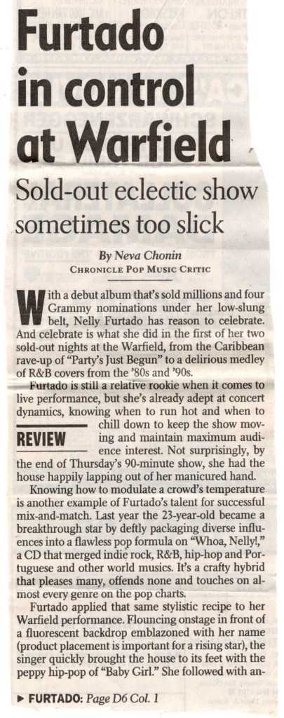 One funny coincidence was that during their song “The Union Forever”, Jack rattled off some lyrics from a song used at a party during the film classic “Citizen Kane” and only a couple weeks before this, I had seen back to back shows of the comedy troupe Kids In The Hall at The Warfield where they did their famous “Citizen Kane” sketch. Indeed, I still could hear Kevin McDonald’s high pitched voice droning loudly, “Citizen Kaaaaane!”, in my head through that song. Most of The White Stripes’ songs were actually pretty short, most of them spanning only two to three minutes, some even less, a welcome departure from the sprawling jam band sagas that The Steve Kimock Band performed on that stage the last time I was there. And though I found Jack’s shrill voice grating, there was no disputing his musical talent as a songwriter and guitarist. I hate Billy Corgan’s voice too, but like him, there are VERY few people who could shred on lead guitar while singing, much less write songs of their calibre.