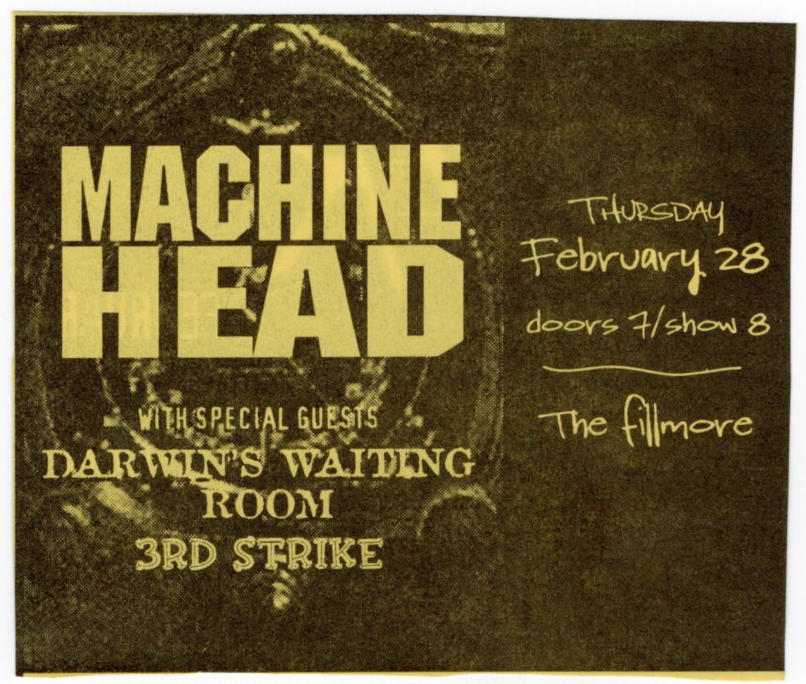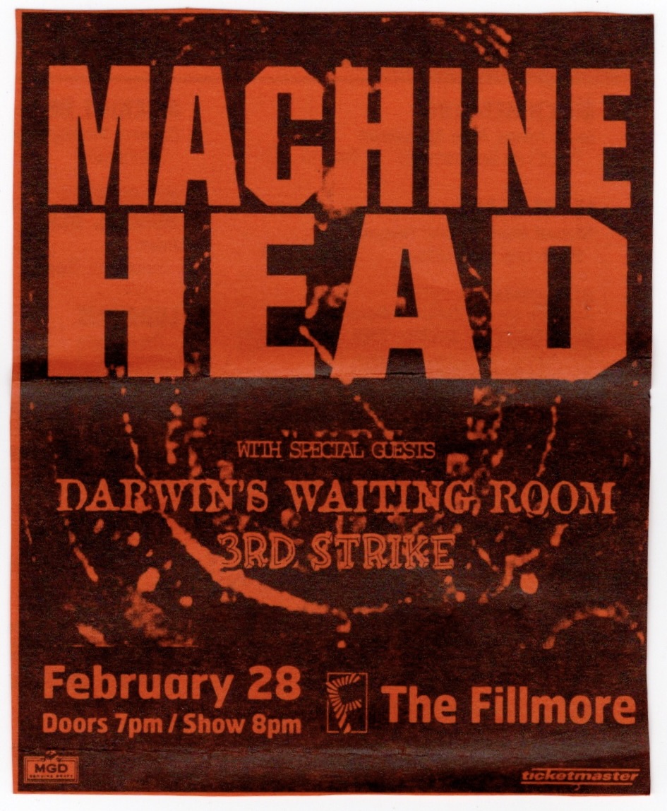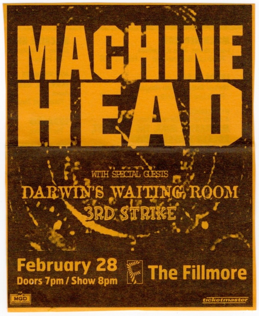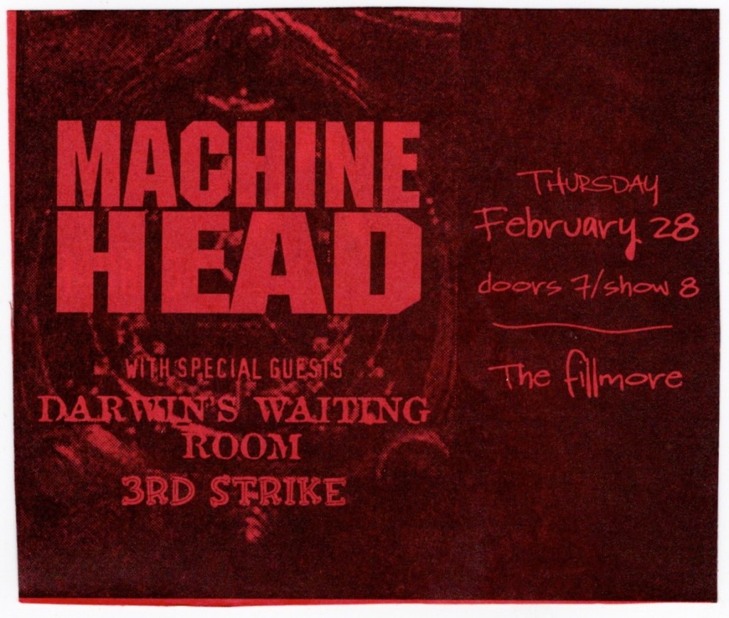The first opener that night was Diesel Machine from L.A. who were fairly new having put out their first album, “Torture Test”, the year before this show. Coincidentally, their guitarist Pat Lachman had played alongside Rob Halford, whose original band Judas Priest had just played on that very same Warfield stage only 12 days before this show, but with Ripper singing instead of Rob. Diesel Machine originally wasn’t listed on the bill and being the opener of a four band show, their set was a quick one. Unfortunately, my recording of them was all messed up, probably a short in the mic or something, but when I stopped it and started it again for Soil, the interference inexplicably mixed itself. Still, the clearest recording in the world couldn’t make their music any less grating. Their singer was quite the screamer and made it next to impossible to figure out their lyrics and song titles, though I managed to make out four out of the six in their songs. At the end of their set, he tried to pump up the disinterested crowd trying to get them to say the name of the song “Driven By Pain” shouting “You know it!”, hearing crickets and then adding, “I heard two people at least”.