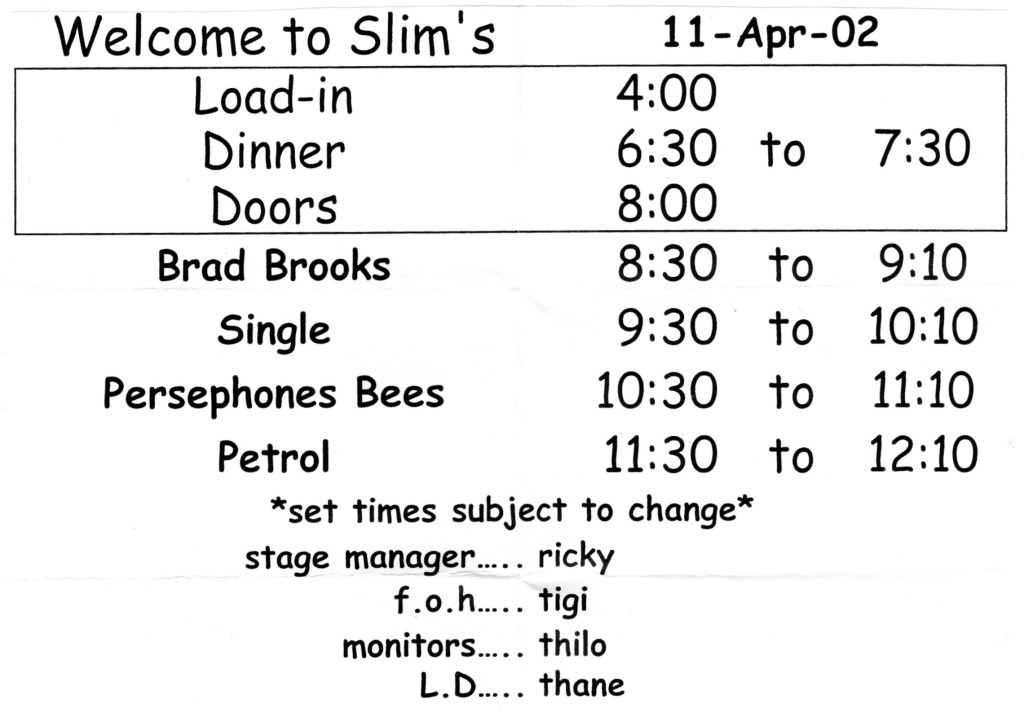 One band that I had seen before and would see again at Slim’s with Persephone’s Bees only three months after this show was Petrol, a local indy rock group that was playing in the poster room that night. Like most poster room acts, they had stripped down to play acoustic, being just the guitarist, the bass player, and for a couple numbers, a female back up singer. They dusted off a few recognizable covers for their sets, doing “Cruel To Be Kind” by Nick Lowe before the show started. Then between main stage acts, they played “Lineman Of The County” which their singer described as “a song made famous by Glen Campbell… We’re going to make it infamous now”. Petrol rounded out their last set with “Angie” by the Rolling Stones. They were a good band and like the other bands on the bill that night, certainly looked the part with their Britpop fashion sense and hairstyles. Incidentally, like The Charlatans, Petrol was also another name that others lay claim to including a Britpop cover band in South Shore, Massachusetts as well as a psychedelic rock trio from Belgrade, Serbia.