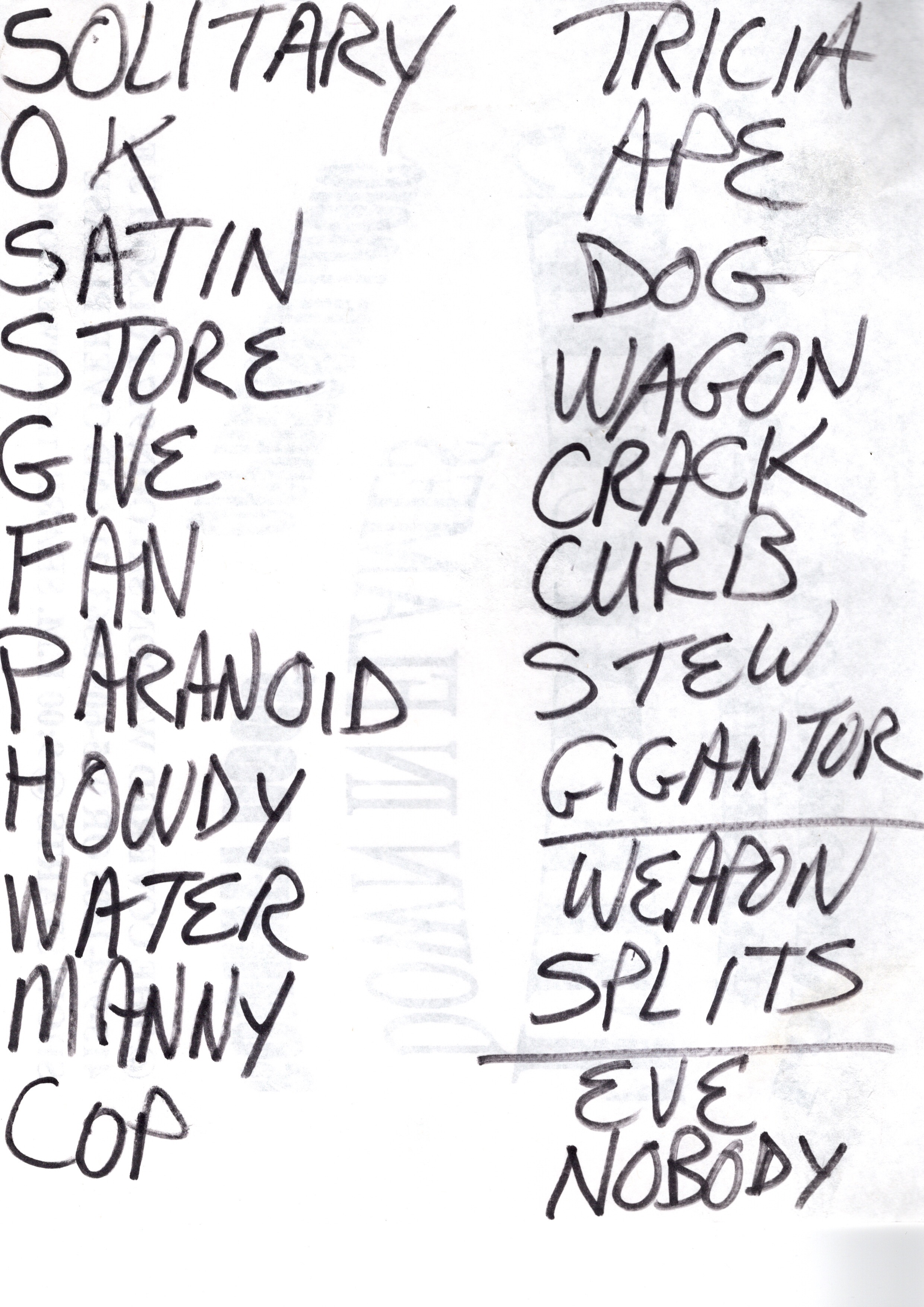 (THE KIRBY GRIPS) : (1st Set) : Washing Machine, Fireman, Restraining Order, Needless, Put Another Record On, (2nd Set) : Mod Boy, (unknown), (unknown), All The Time