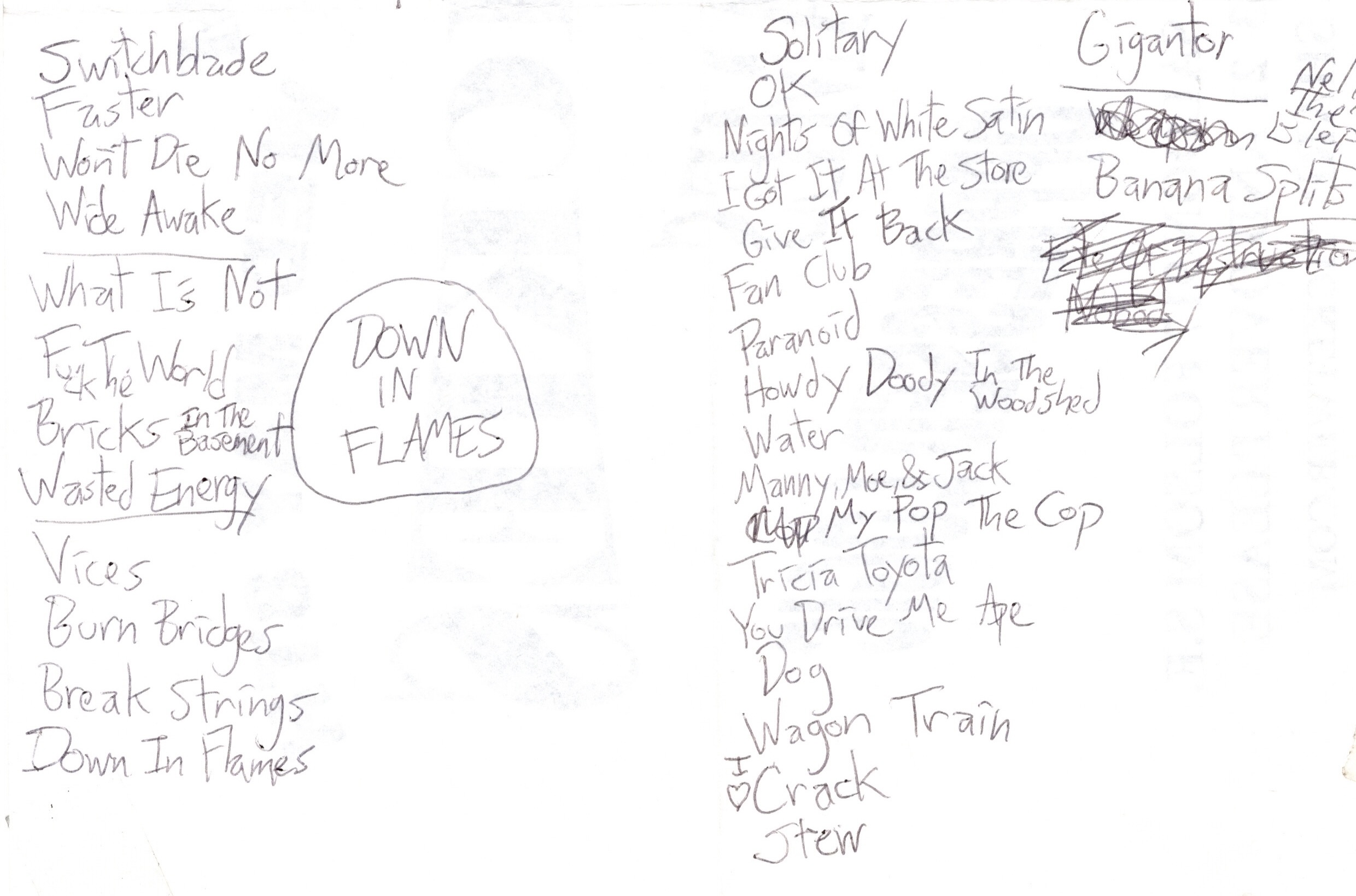 (HOT ROD CIRCUIT) : Because I Got High Intro – Radiation Suit, At Nature’s Mercy, Knees, Flight 89 (North American), Let’s Go Home, Radio Song, The Night They Blew Up The Moon, Get What You Get, Now Or Never, Consumed By Laziness, The Pharmacist