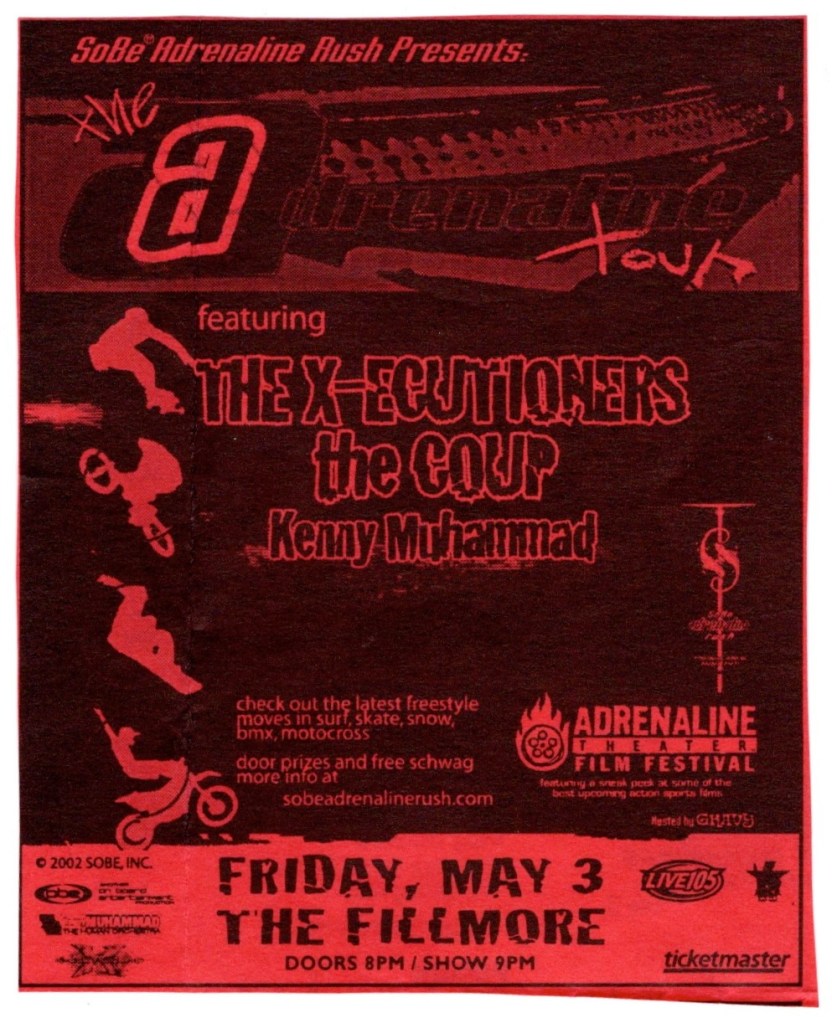 Later, they did a little of the customary splitting up the crowd to which side was the loudest and one of them made a reference to the fight that night, taunting the other side, “Obviously, we got a bunch of Mike Tyson fans over here. You about to be knocked the fuck out!” They finished their set with “You Never Know” and had no problem getting all of us to shout “The Hieroglyphics yeah!” during the chorus. They thanked us again adding that it was “overwhelming… all of us here on stage”. Sadly, there wasn’t a poster to be given out as there was the night before for The Get Up Kids, a very sharp turn in musical styles between these two acts. But it would only be a year later when the Hiero crew would return to headline on that stage and I would also see them in 2005 at The Warfield at the SW Weekly Music Awards.