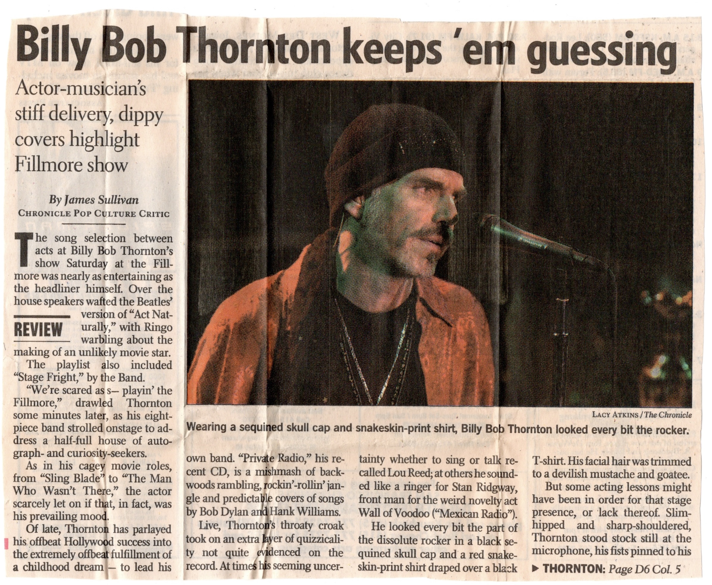 After the ear splitting, bombastic metal of Static X and Soulfly at The Warfield the night before, the music of Mr. Farrar at The Fillmore was downright soothing. That goes double for the crowd as well, replacing the black clad, hesher hordes in the mosh pit with a calm herd of subdued, alt-country librarians. I’d seen Jay with his other band Son Volt on that stage in 1996, but never saw him when he was in Uncle Tupelo with Jeff Tweedy. Coincidentally, Jeff and his band Wilco had just finished a three day stint at The Fillmore only two months before this show. With Son Volt on hiatus since ’99, Jay was promoting his first album as a solo artist called “Sebastopol”, named after the Ukrainian port town and the birthplace of the open-G Vestapol guitar tuning technique… whatever that is. He had been in the bay area the year before playing at Slim’s, but I missed that one. Almost half his set were new songs, but rest assured, he dusted off some golden oldies from his aforementioned previous bands.
