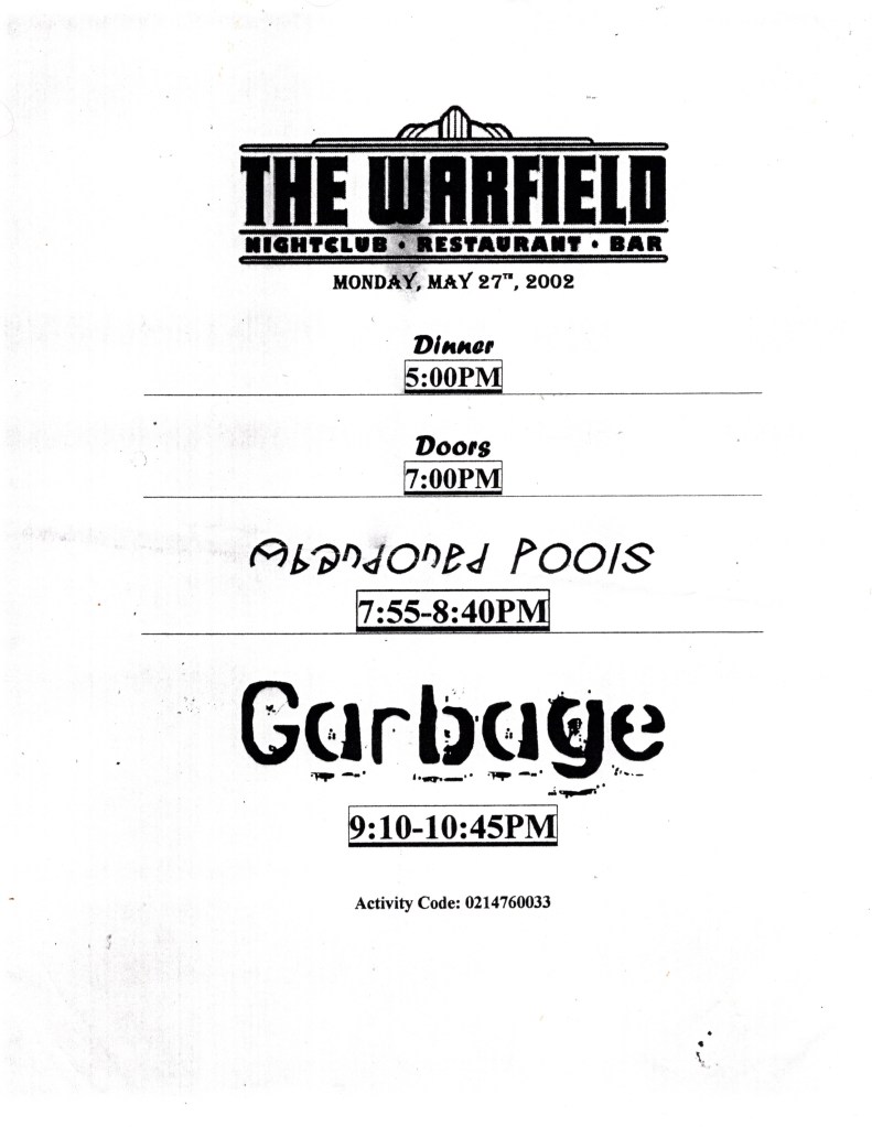Garbage, Abandoned Pools – Warfield, SF, Mon., May 27