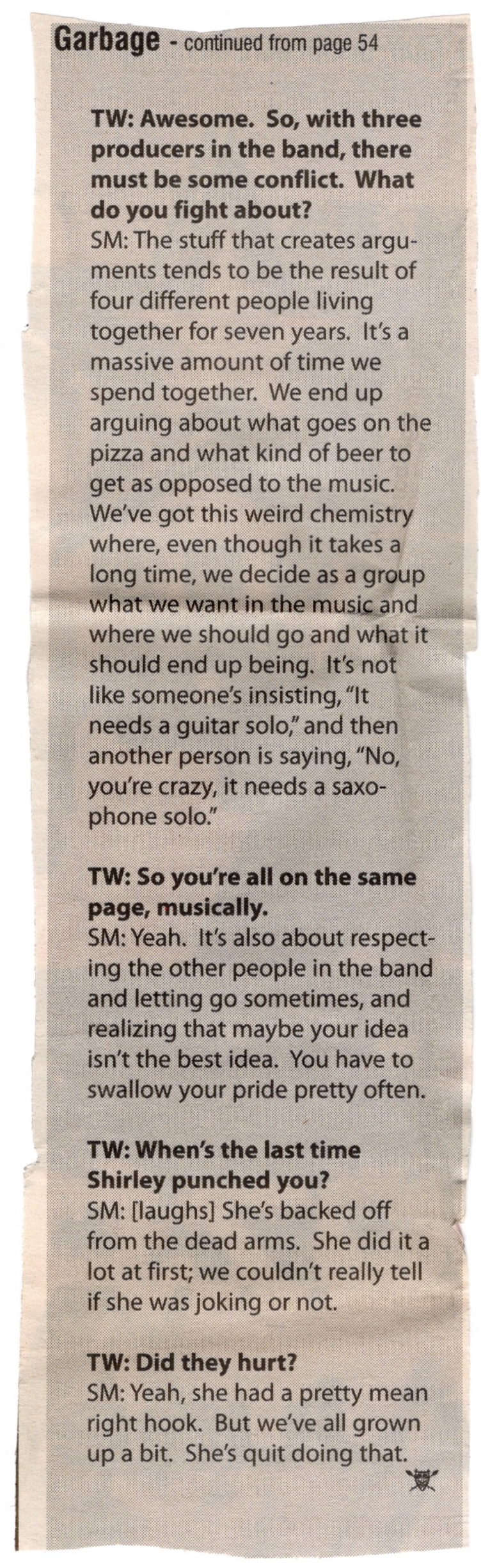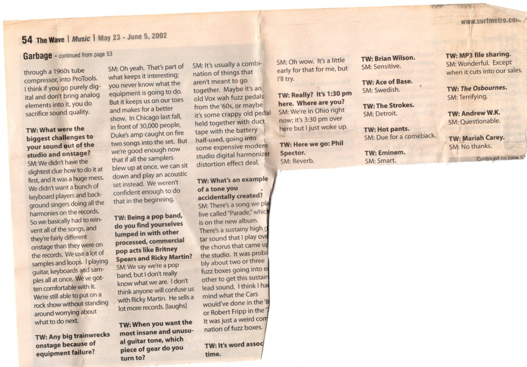 By this time, singer Shirley Manson was having throat problems, which she mentioned repeatedly during their set that night. Her voice would go out entirely a month after this show at the unfortunate time as they were performing at the Roskilde Festival in Denmark. Eventually, it had been discovered that she developed a vocal fold cyst that was safely removed by corrective surgery. Gwen Stefani, the singer of the aforementioned No Doubt and fellow rock hard midriff goddess, recommended a voice specialist and Shirley soon was back in the pink again. But to make matters worse, Butch Vig, their drummer and producer extraordinaire got sick twice on this tour, first with a bout of Hepatitis A and Bell’s Palsy, a second time with food poisoning. He even was replaced briefly by Matt Chamberlain while he recovered.
