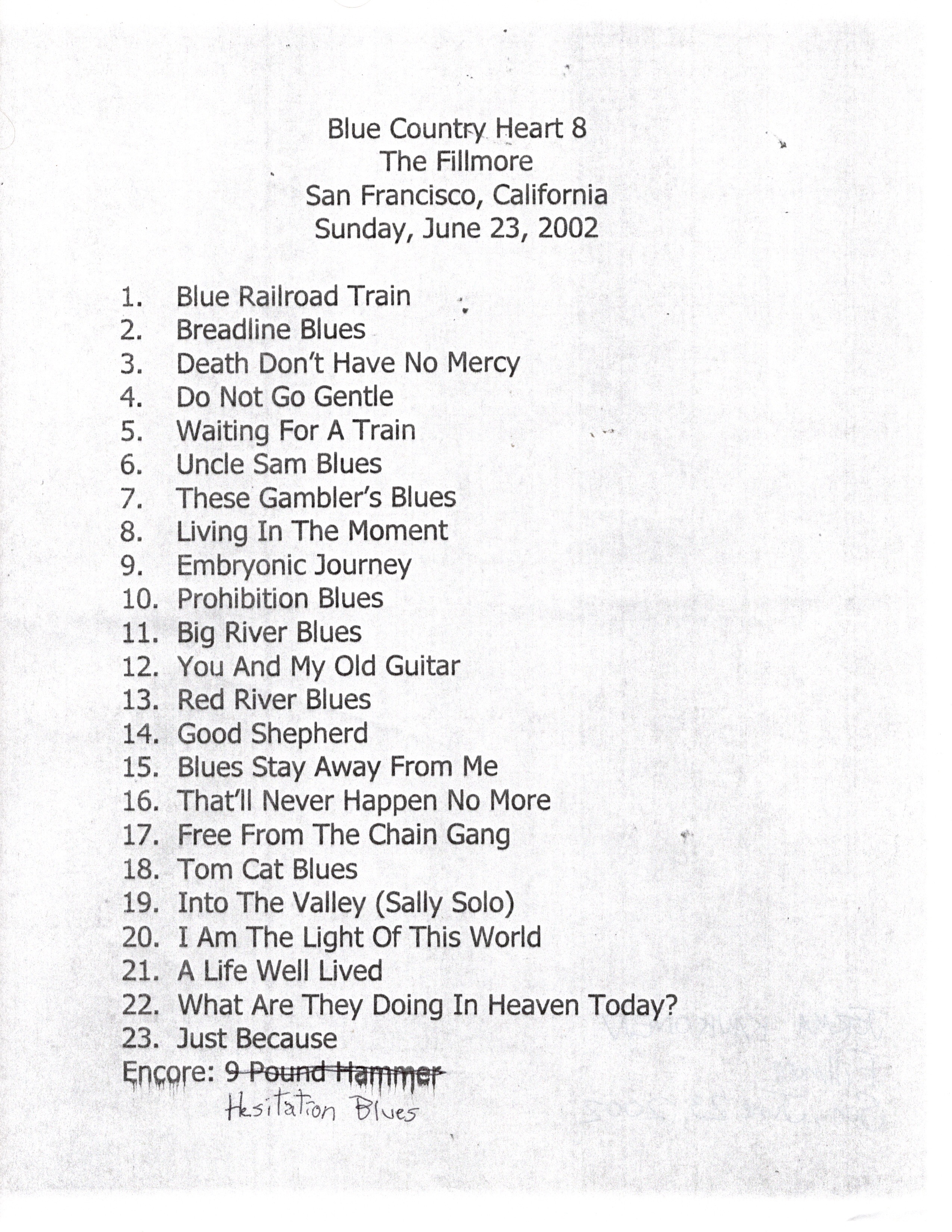 SETLIST : Good Religion, (unknown), Run Along For A Long Time, Nobody’s Fault But Mine, (unknown), (unknown), Give A Man A Home, Motherless Child, Amazing Grace, Way Down In The Hole, If I Had A Hammer, Across The Bridge, Do Lord, (unknown), What A Friend We Have In Jesus, Someone Watching Over Me, (unknown), The Last Time