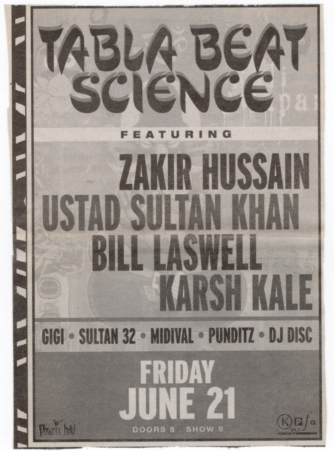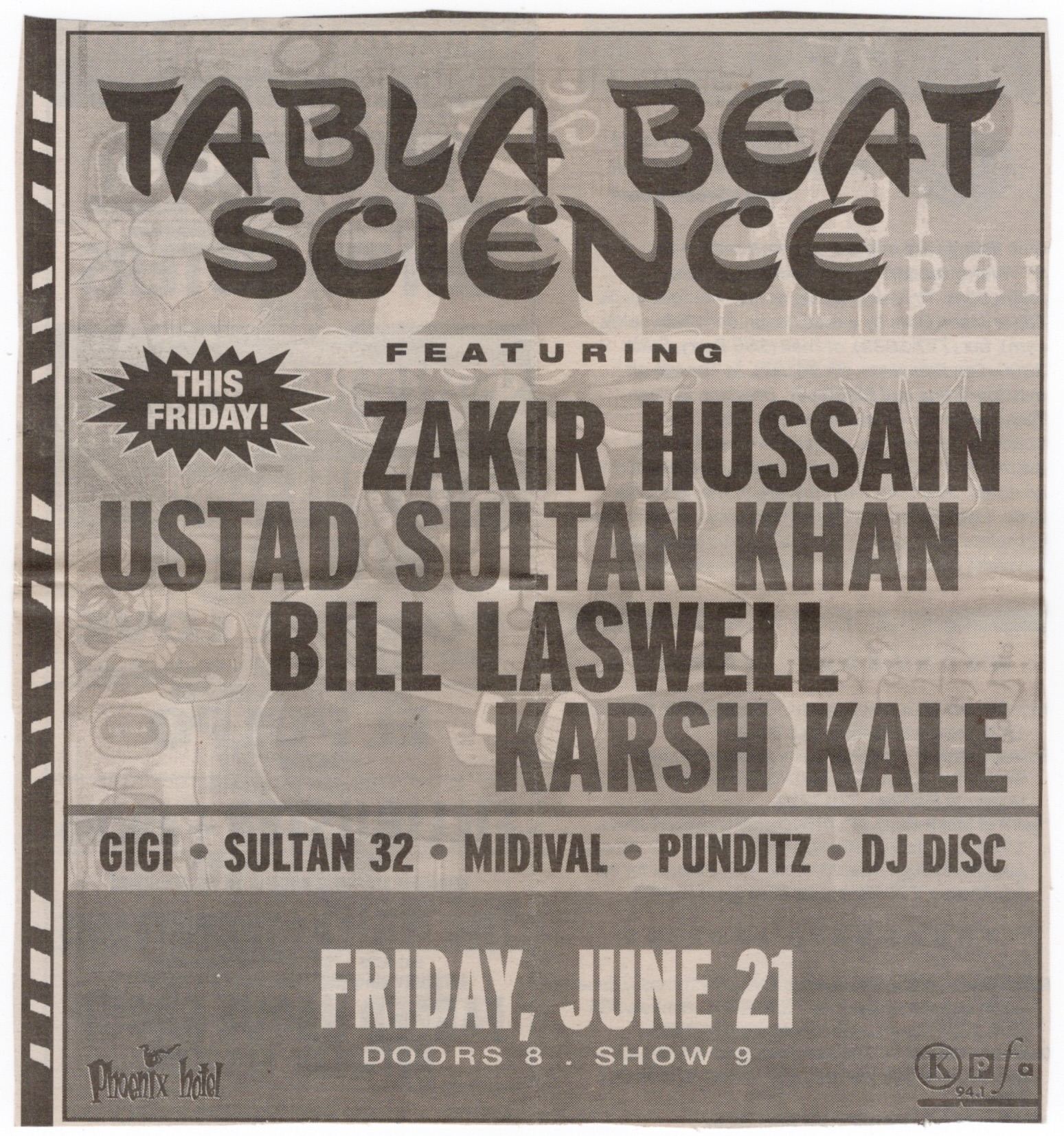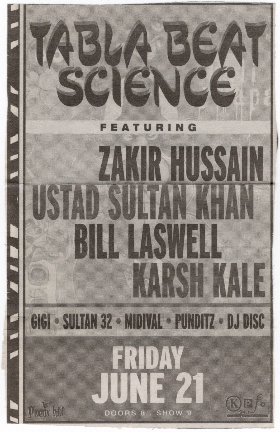 This group was brand new, but had actually been in town the year before sharing their debut performance at Stern Grove. They took the recording from that show and made a live album from it, rereleasing it as a double album earlier the next year. Talvin Singh had been in the band then on tablas, but he wasn’t touring with them this time. This show was sponsored by KPFA and The Phoenix Hotel, a popular and fashionable place for bands to stay in town which was just a few blocks from where I lived then in The Tenderloin. Tabla Beat Science would also go on to play at the Sierra Nevada World Music Festival the next day and then the Montreal Jazz Festival the week after. Somebody from the aforementioned radio station came out to introduce the band and somebody in the crowd shouted to him, “You rock!” for which he replied, “I paid him $50 to do that”. He then praised the band, calling them “well respected” and some of “the best musicians of our time”.