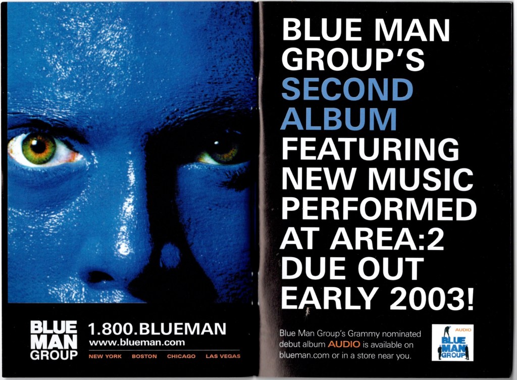 (BLUE MAN GROUP) : (unknown), (unknown), (unknown), Up To The Roof, Persona, (unknown), Your Attention, White Rabbit, Sing Along, I Feel Love, The Complex, What Is Rock