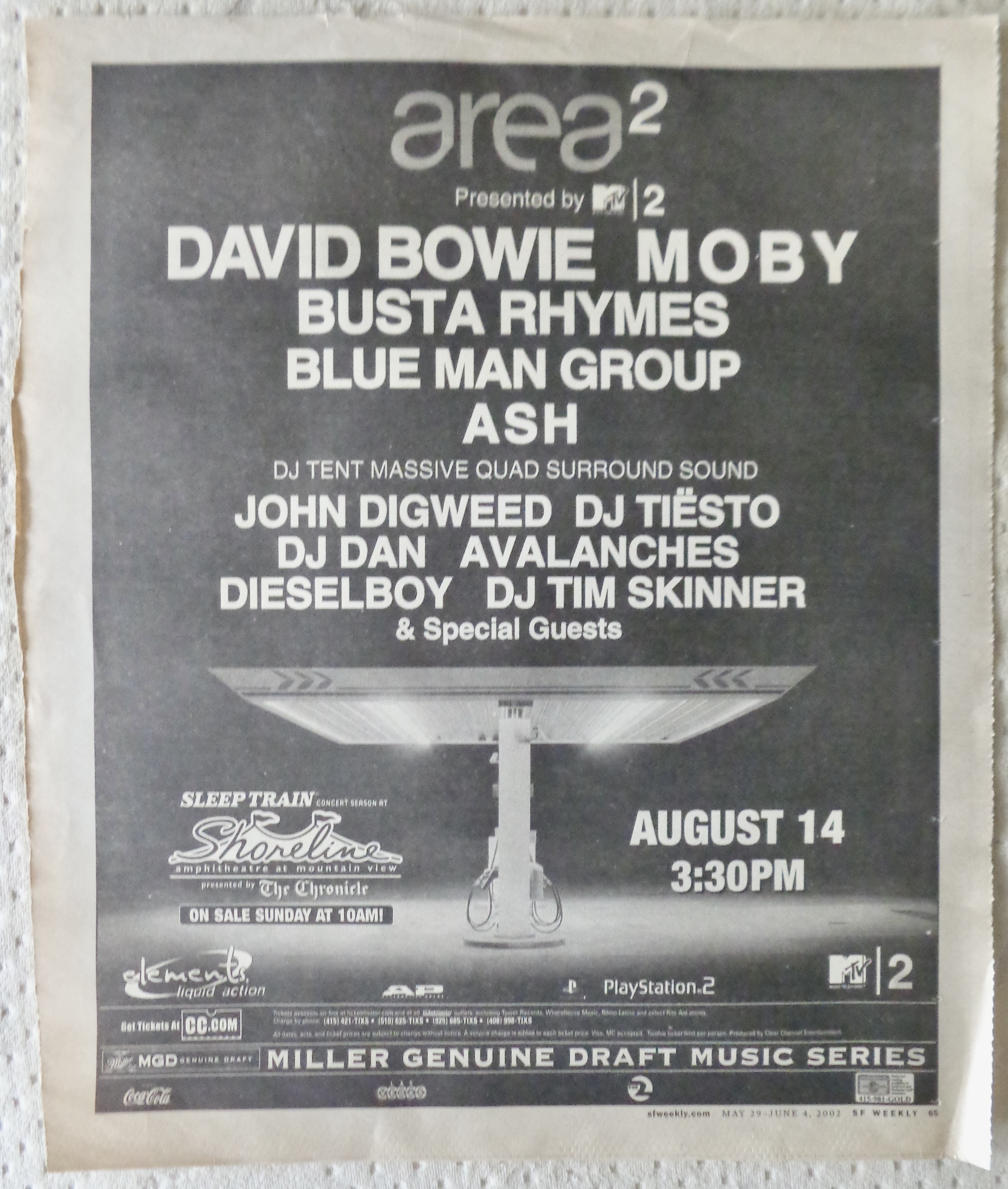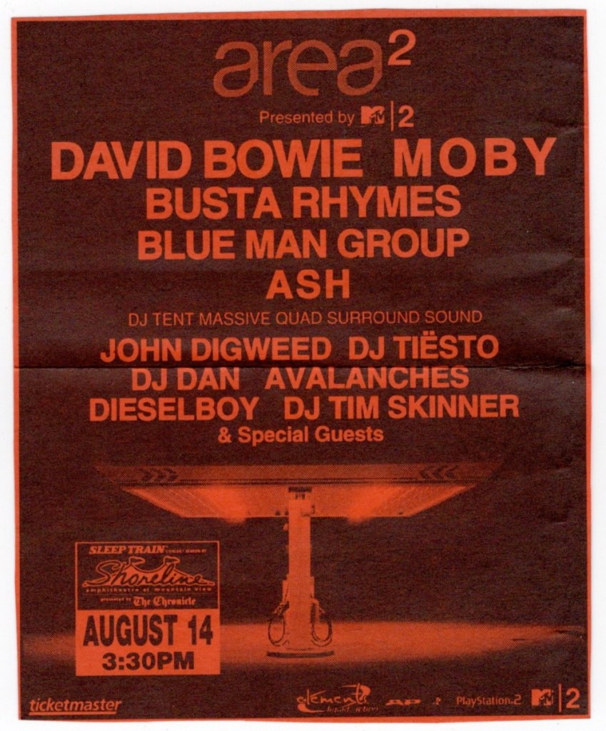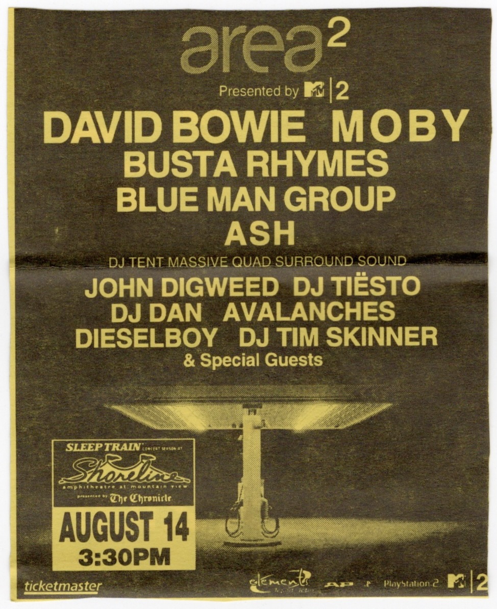 Area 2: Moby, David Bowie, Busta Rhymes, Blue Man Group, Ash, John Digweed, DJ Dan, DJ Tiesto, Shoreline, Mountain View, Wed., August 14