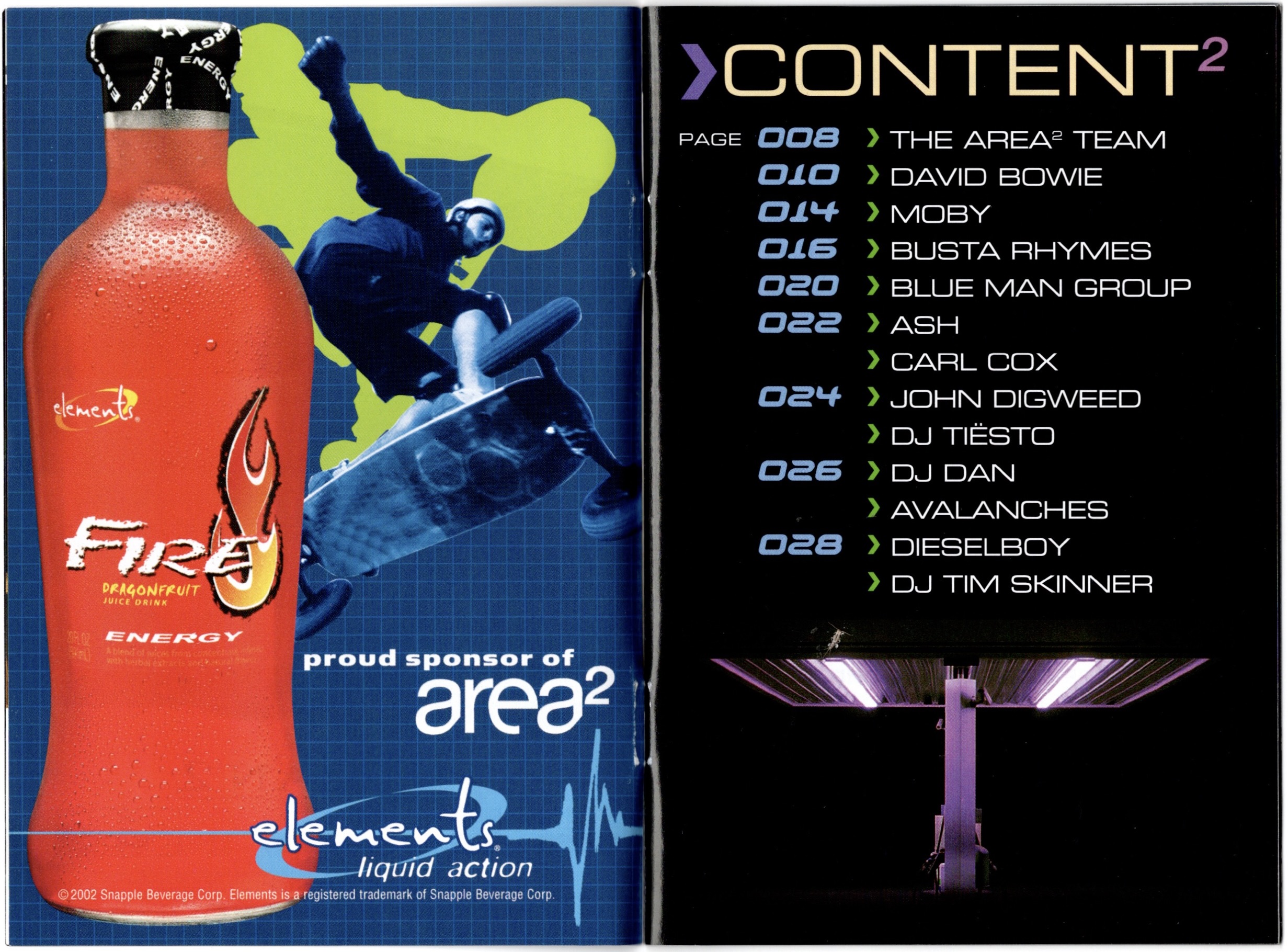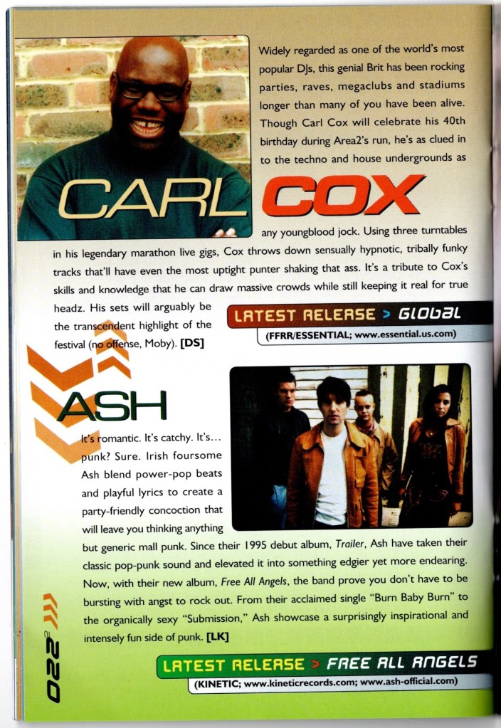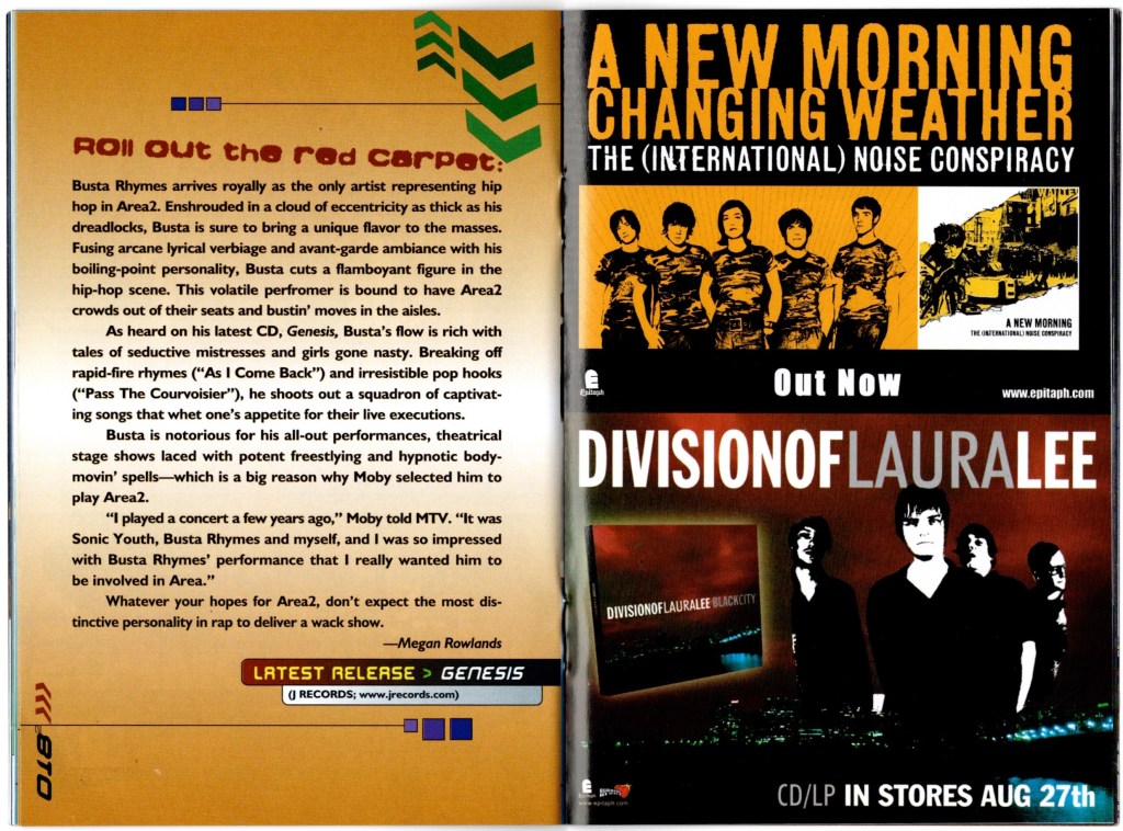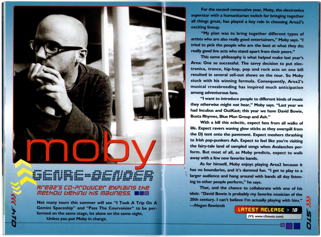 Area 2: Moby, David Bowie, Busta Rhymes, Blue Man Group, Ash, John Digweed, DJ Dan, DJ Tiesto, Shoreline, Mountain View, Wed., August 14