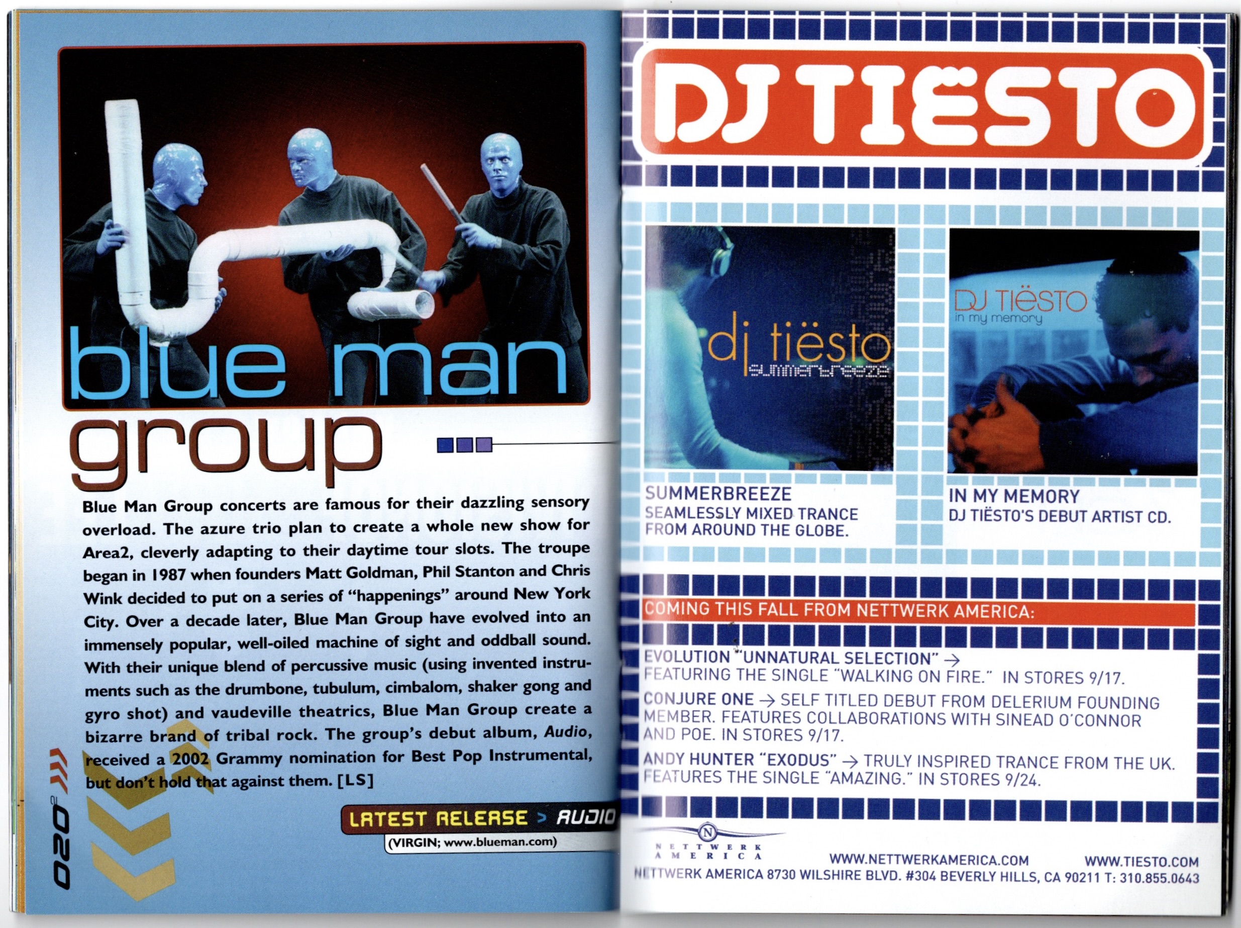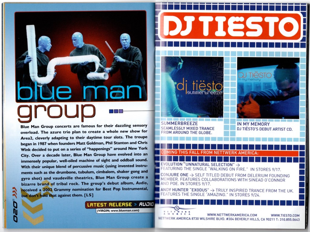 Theatrical and maybe even downright gimmicky as they were, I was instantly impressed by the skills as percussionists and the homemade instruments they came up with were truly original as well. Though they were known as an instrumental band, these blue weirdos apparently sworn to a vow of silence, this time they had brought along a female singer, Annette Stream from the band Venus Hum. She had a beautiful voice and did a brilliant cover of “White Rabbit” by Jefferson Airplane, a high bar vocally, especially at Shoreline, the house that hippie music guru Bill Graham himself built. But the Blue Man Group’s cover of the disco anthem “I Feel Love” by Donna Summer was positively transcendent. Seriously, it gave me a feeling of total serenity even hearing it again all these years later and I still consider it one of the best cover songs I have ever heard. I was glad that I finally got to see them and would be lucky to catch them once more only a year later at The Warfield, up close and personal that time. When they were done, I high tailed it back to the DJ tent and caught a little more of DJ Dan too.