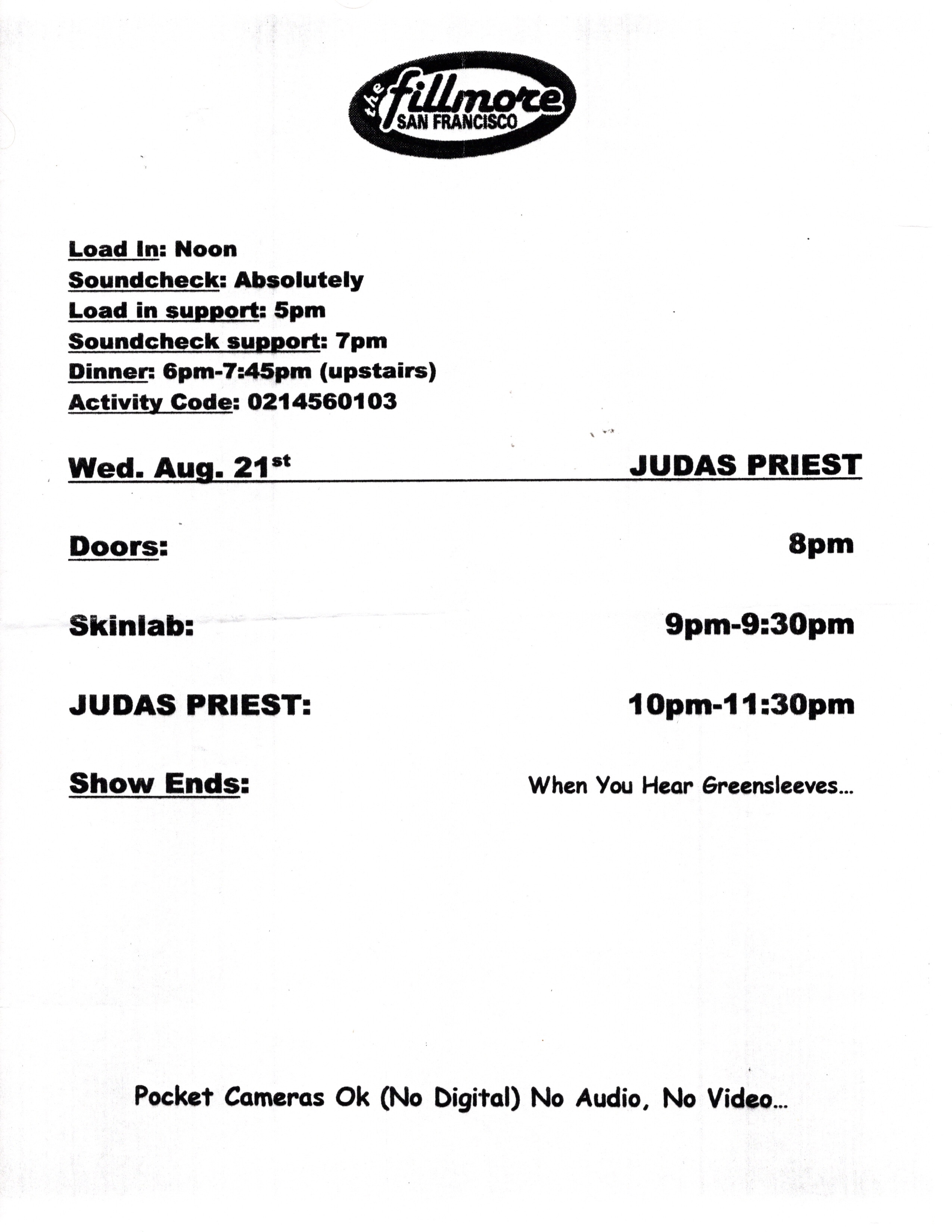 Judas Priest, Skinlab, Brian Kenny Fresno – Fillmore, SF, Wed., August 21