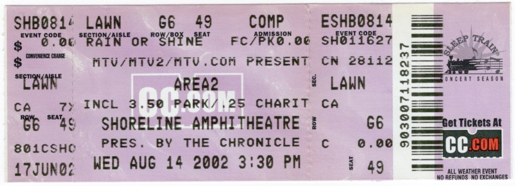 I had mused to Matt during the show that I guess the next year’s festival would be called “Area 3”, but it wasn’t to be. As of today, 24 years later, the Area tours remain on infinite hiatus which is a shame. It was genuinely an eclectic tour, whose variety in genres was appreciated, especially with the end of the Lollapalooza tours. For whatever reason the festival stopped, it coincided with the beginning of a rough patch with Moby. But he was having a banner year in 2002, perhaps the very height of his career, having released his “18” album that May, the long awaited follow up to his breakthrough blockbuster, “Play” and the single “Extreme Ways” would be used in the soundtrack for the action film “The Bourne Identity” as well as all of its sequels. After this tour, Moby even would go on to perform at the closing ceremony at the Winter Olympics in Salt Lake City. The bad news was that he was experimenting with alcohol, drugs, and getting his freak on, not to mention the inexplicable feud he was sharing with Eminem at the time. He called Moby a “36 year old, bald headed fag” and Moby countered that Eminem had “an unrequited crush” on him. Anyway, back to the show.
