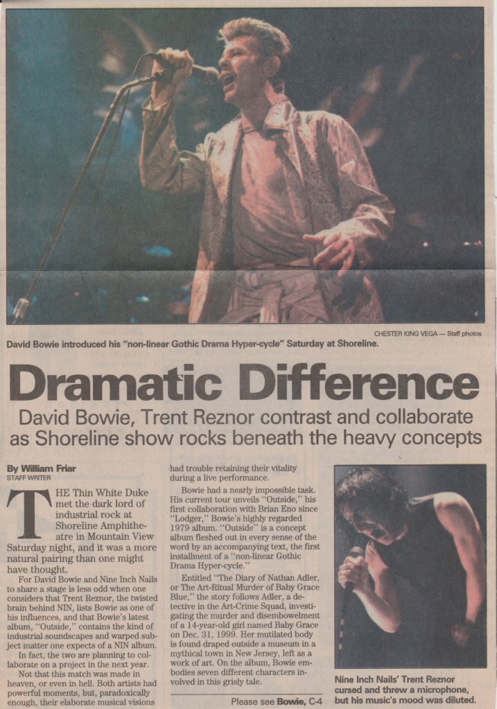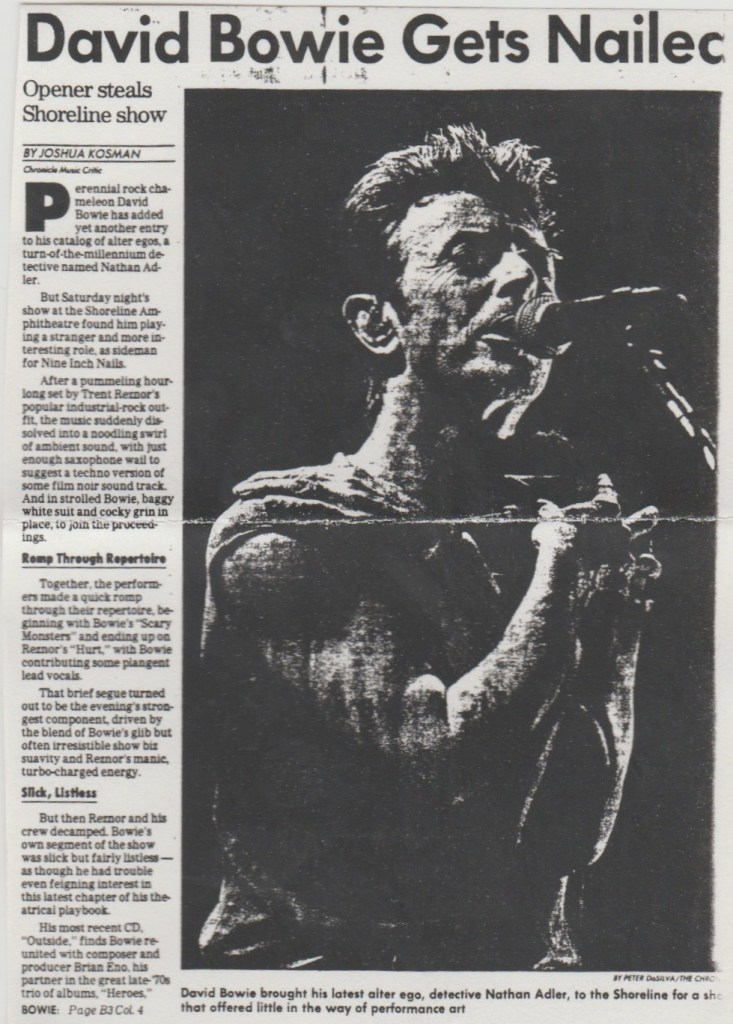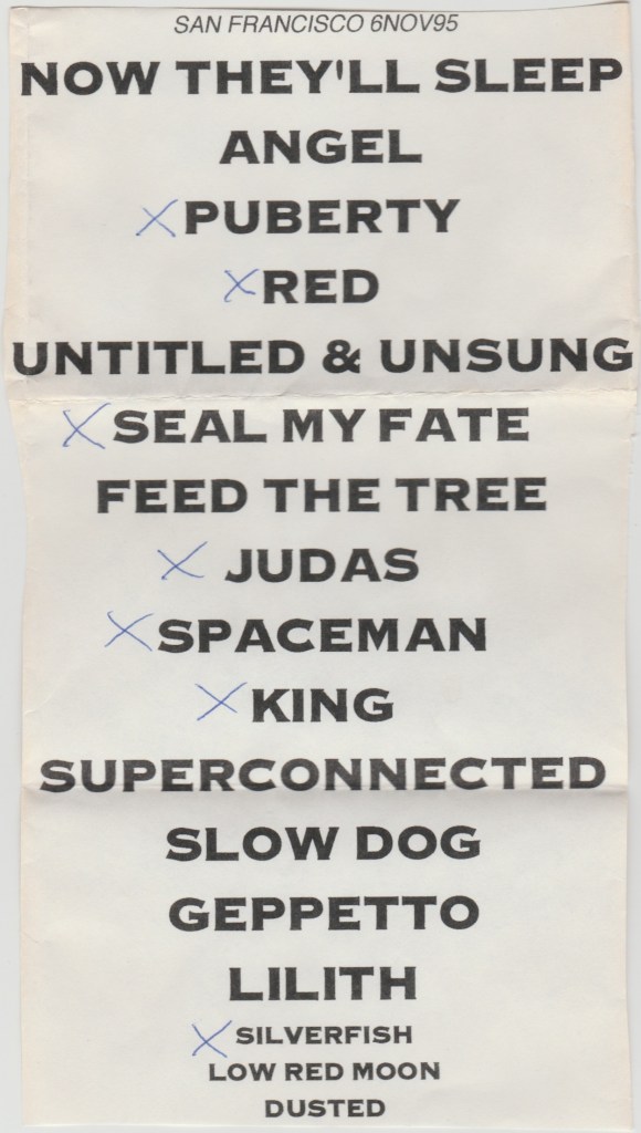 The other day, I was talking about this show with a friend of mine I work with named Jeff, who was with BGP at the time as a stagehand and worked that show. He told me that it was the last tour Manson did not wearing those creepy contact lenses that we are now accustomed to seeing him in. Jeff said when he came back to headline the Warfield two years later, he ran into him backstage and said dryly, “I see you’re doing the David Bowie thing now, eh?”. Marilyn gave him the cold shoulder after that.