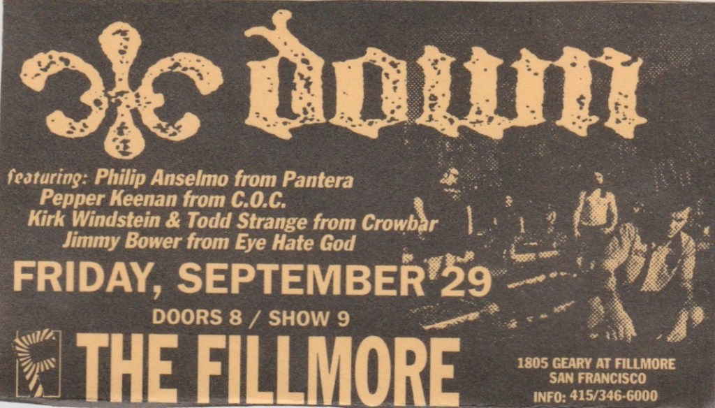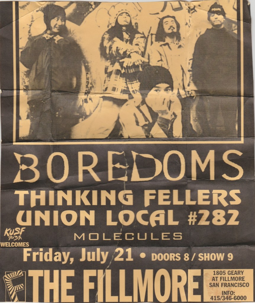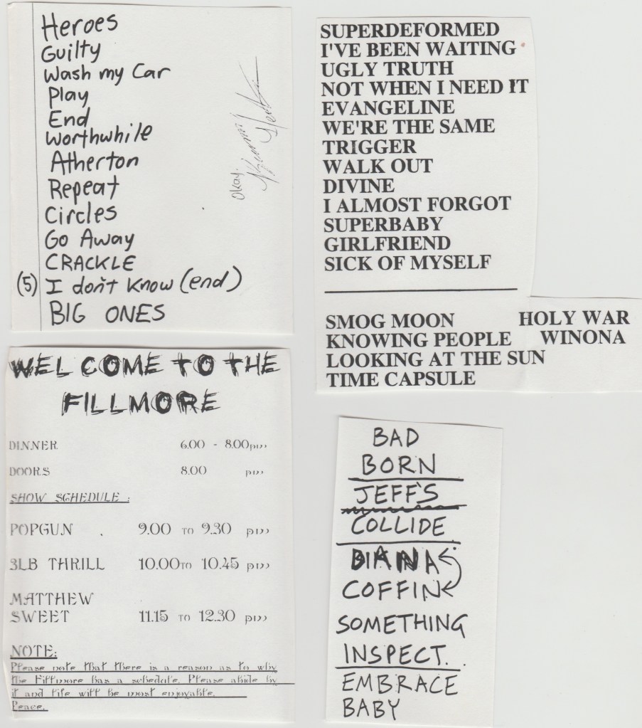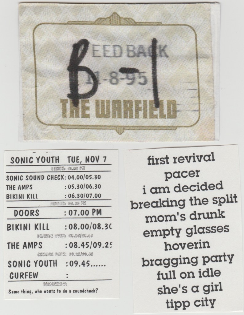 This was one of my favorite shows I’d ever see at the Fillmore and it was unique that it was one of only a handful of early-late shows, one show starting at 8 PM, the late show starting at 11. I was unaware of this double show arrangement coming into usher that night, so I only brought enough tapes for one show, so I chose the later one. I knew I’d be cut from working and I’d be able to go up front to get better sound. That, and the later of the two shows when early-late shows happen is usually the superior one. The bands are warmed up and the crowd is drunker.