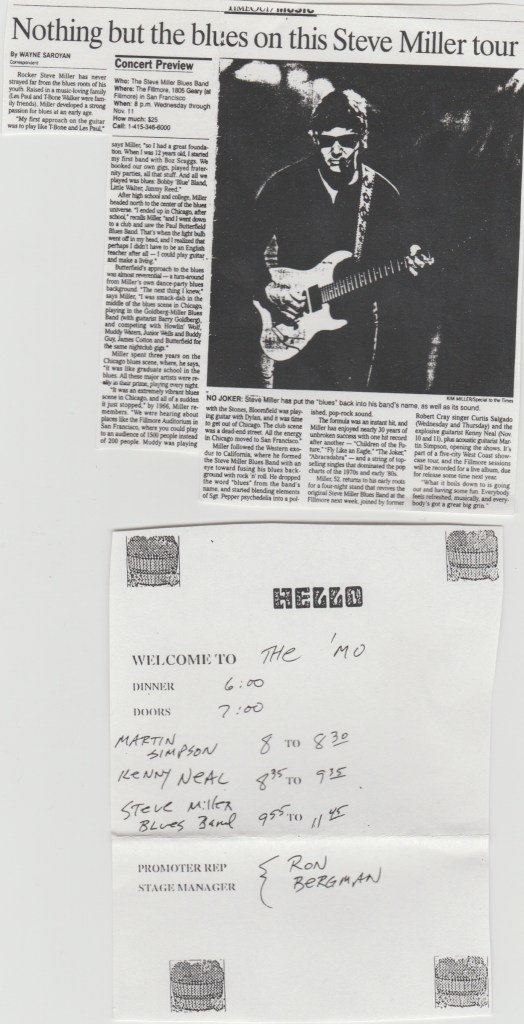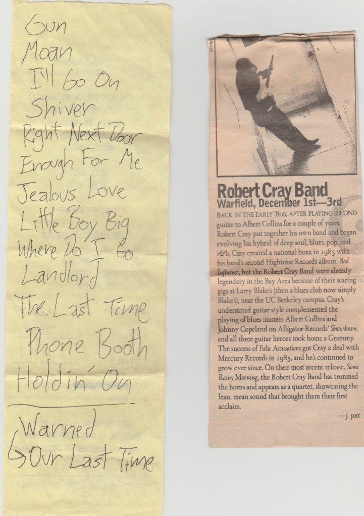 I was relieved to get cut from ushering after Robert Cray started. The blues crowd are notorious for their voracious drinking and the lines at the bar were making it difficult to keep my aisle clear. I was even happier after I had a couple beers myself and joined in the crowd. It was obvious to me from the start that Cray was a real pro as was his band. This was a fellah who had been touring for twenty years by then and all his Grammys were well deserved. Unfortunately, my mic was starting to give out during that show and really cut in and out in the middle of the set between “Enough For Me” and “Little Boy Big”. This was the only time I saw Cray, but he’s still around today and I might get my chance again some day. Pity there was no poster, an unpleasant surprise considering he was doing a three day run.