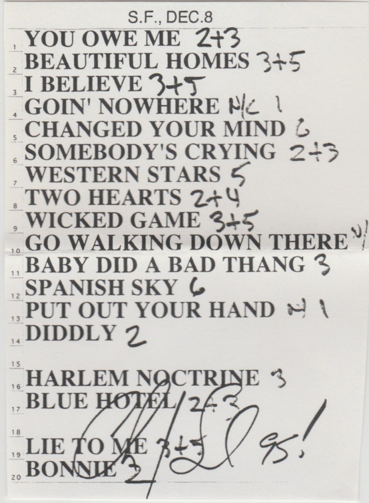 SETLIST : You Owe Me, Beautiful Homes, I Believe, Goin’ Nowhere, Changed Your Mind, Somebody’s Cryin’, Western Stars, Two Hearts, Wicked Game, Go Walking Down There, Baby Did A Bad Bad Thing, Spanish Sky, Put Out Your Hand, Diddley, Blue Darling, Harlem Nocturne, Blue Hotel, Lie To Me