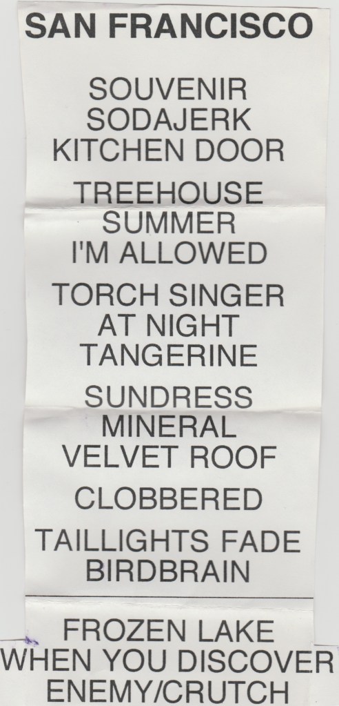 I’d seen Sister Double Happiness only once before opening for Nirvana at the Warfield and I really liked their stuff, so I was glad to catch them at the Great American. I believe this was the first time I’d see a show at this venue and I was impressed to say the least. To this day, it is perhaps the most beautiful venue I’ve even been inside of and I’ve seen a few. I moved just a couple blocks away from it two years later and lived at that studio for almost 17 years. I still have mixed feeling about living in the Tenderloin especially for that long, but easily the biggest perk was having that venue as my living room. They had in and out privileges too, so I could go home between sets and get high or whatever. I even did laundry between sets at one show.