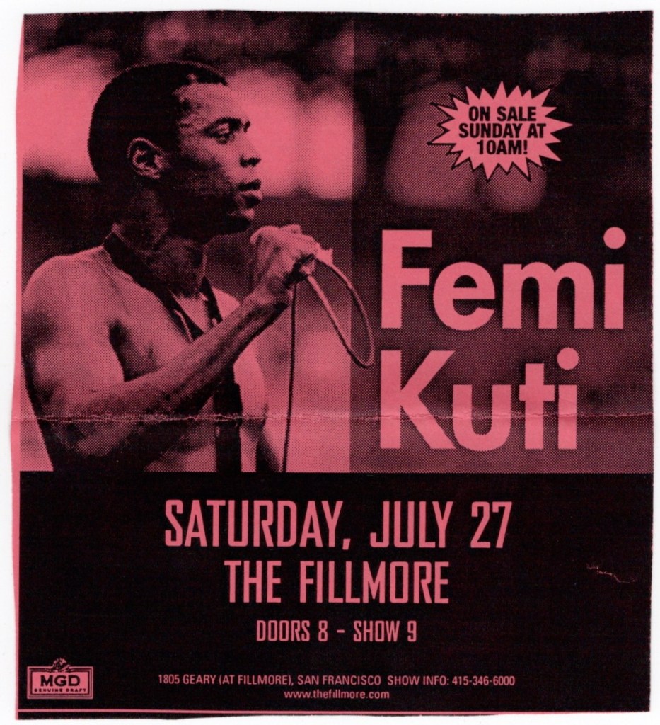 He livened things up after, getting the crowd to do the usual call and response chanting and there were a lot of talented dancers on and off the stage. Halfway through the set, Femi got us all to step together, “To the right, the the left, to the right, to the right” and later dance low to the ground. There was no poster that night, but I would see Mr. Kuti again on that stage two years later, though I wouldn’t see him again until 2018 at Stern Grove. I am happy to say that the Kuti musical line is in good hands with Femi’s son, Seun Kuti, who had been performing with his dad since he was nine years old, singing and playing sax. He has since grown into an extremely talented headliner of his own who I’ve seen a couple times playing alongside his father’s old band, Egypt 80.