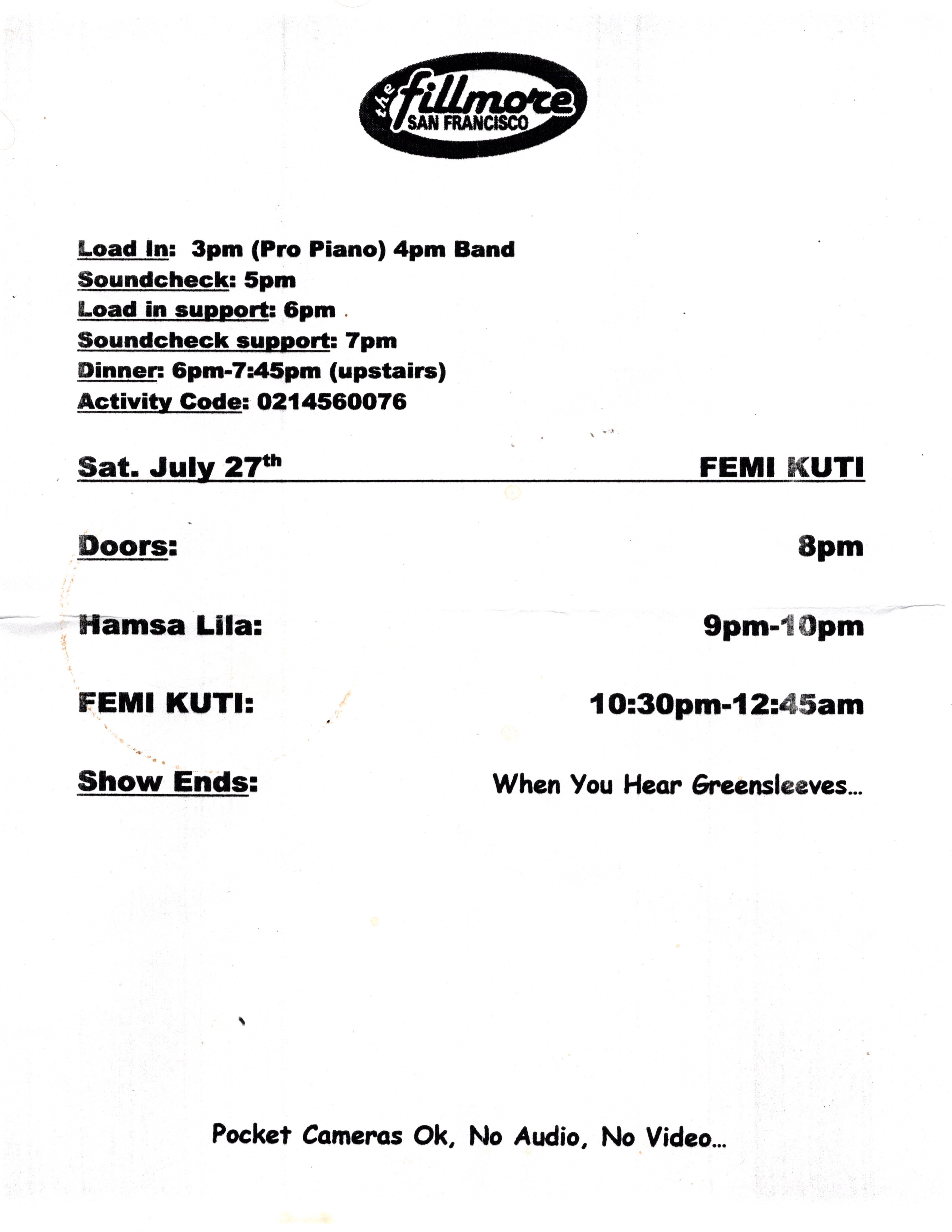Femi Kuti, Hamsa Lila – Fillmore, SF, Sat., July 27
